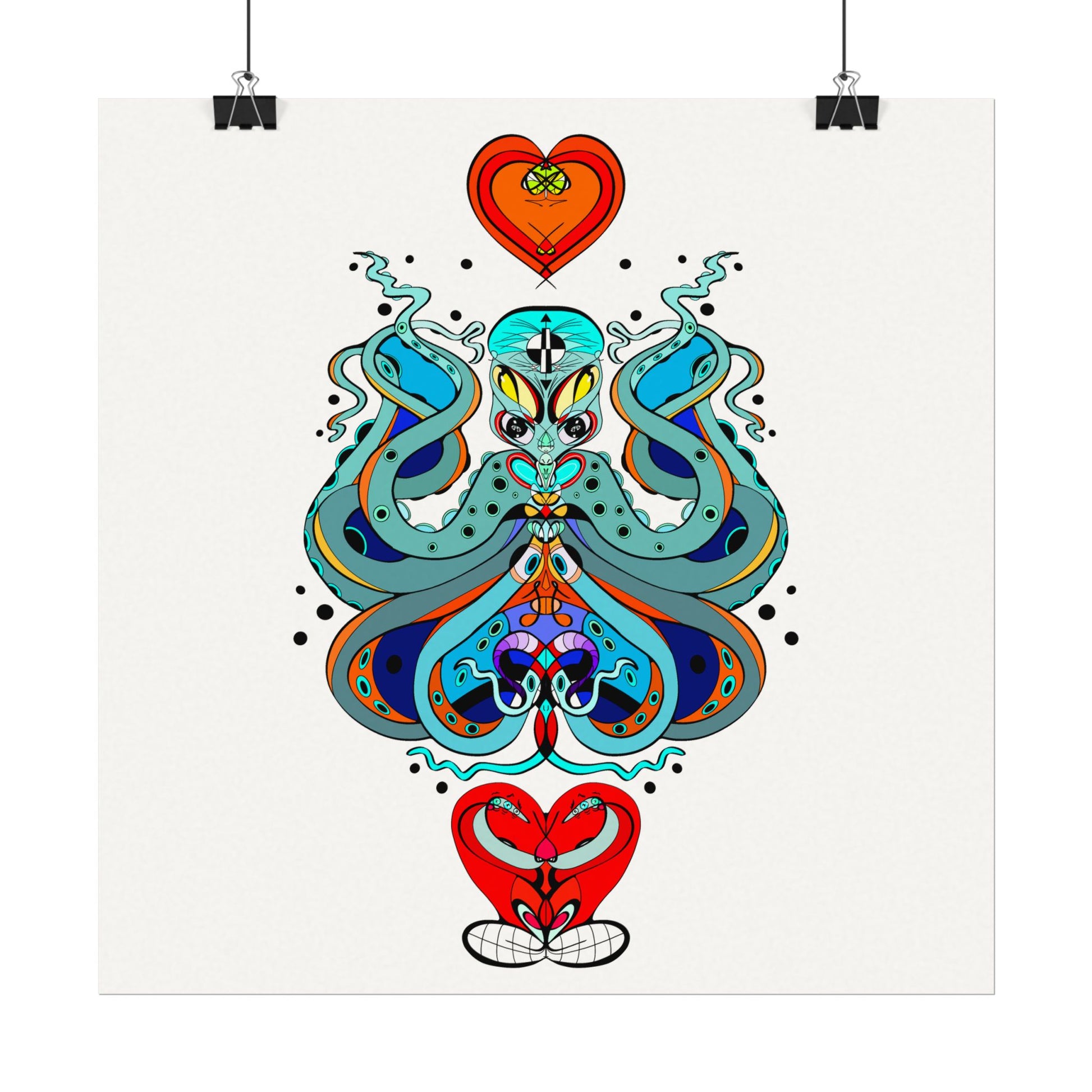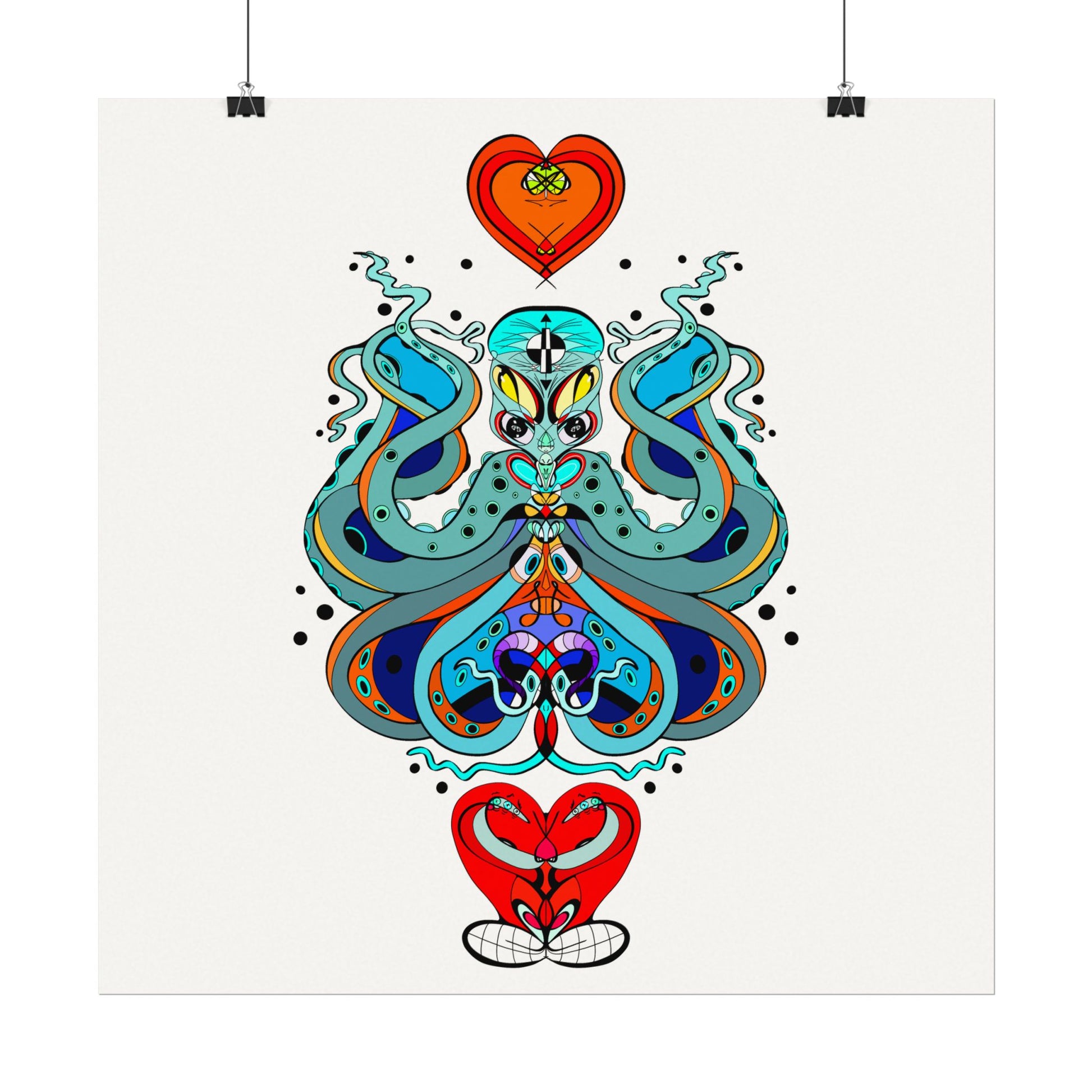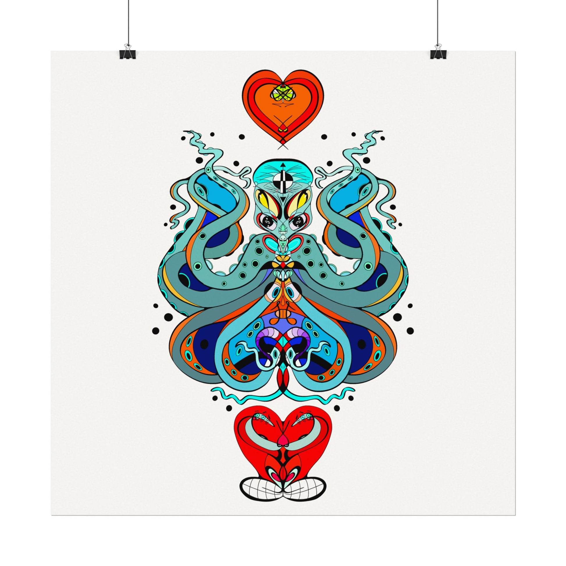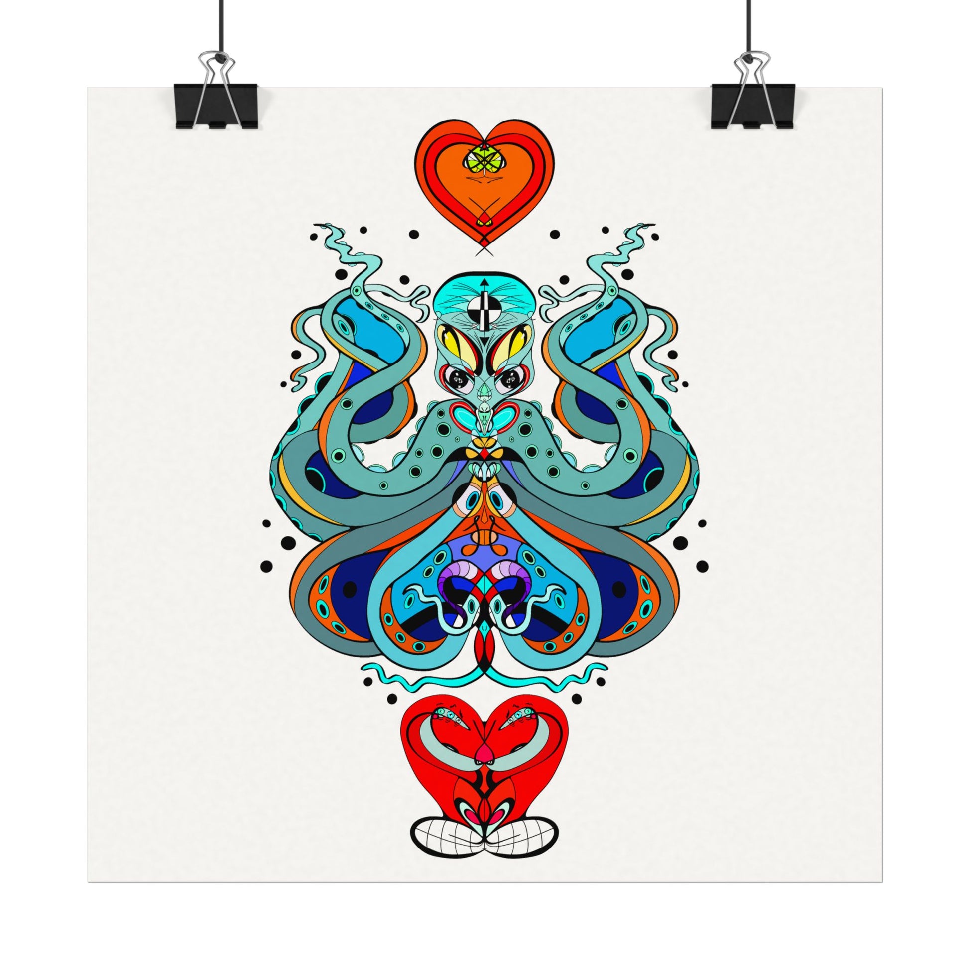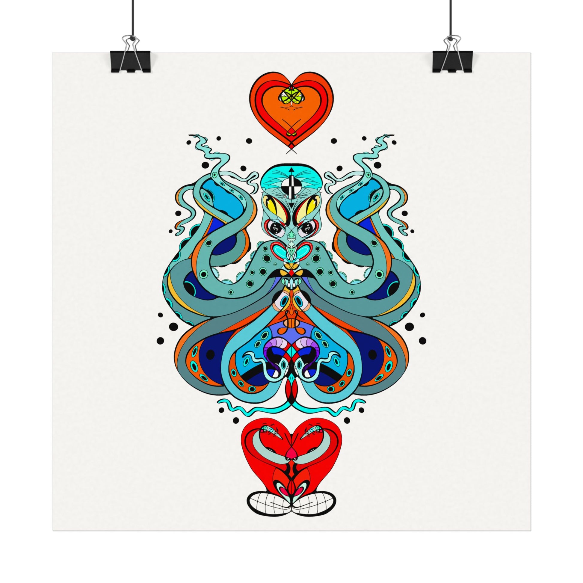 This textured watercolor matte poster brings bold, hand-drawn energy into a calm, gallery-ready form. Bright teals, deep blues and pops of red form a symmetrical, slightly mystical figure that feels both playful and meditative. Printed on heavyweight 285gsm textured watercolor paper with archival inks, the design keeps its painterly depth—subtle grain, velvety matte finish, and vivid color transitions that draw the eye without glare. Hang it in a reading nook, a creative studio, or a living room where curiosity and color are welcome. The artwork sits well surrounded by plants, mid-century furniture, or layered with other prints to create an eclectic wall cluster for a space that leans toward boho, modern folk, or contemporary spiritual aesthetics.