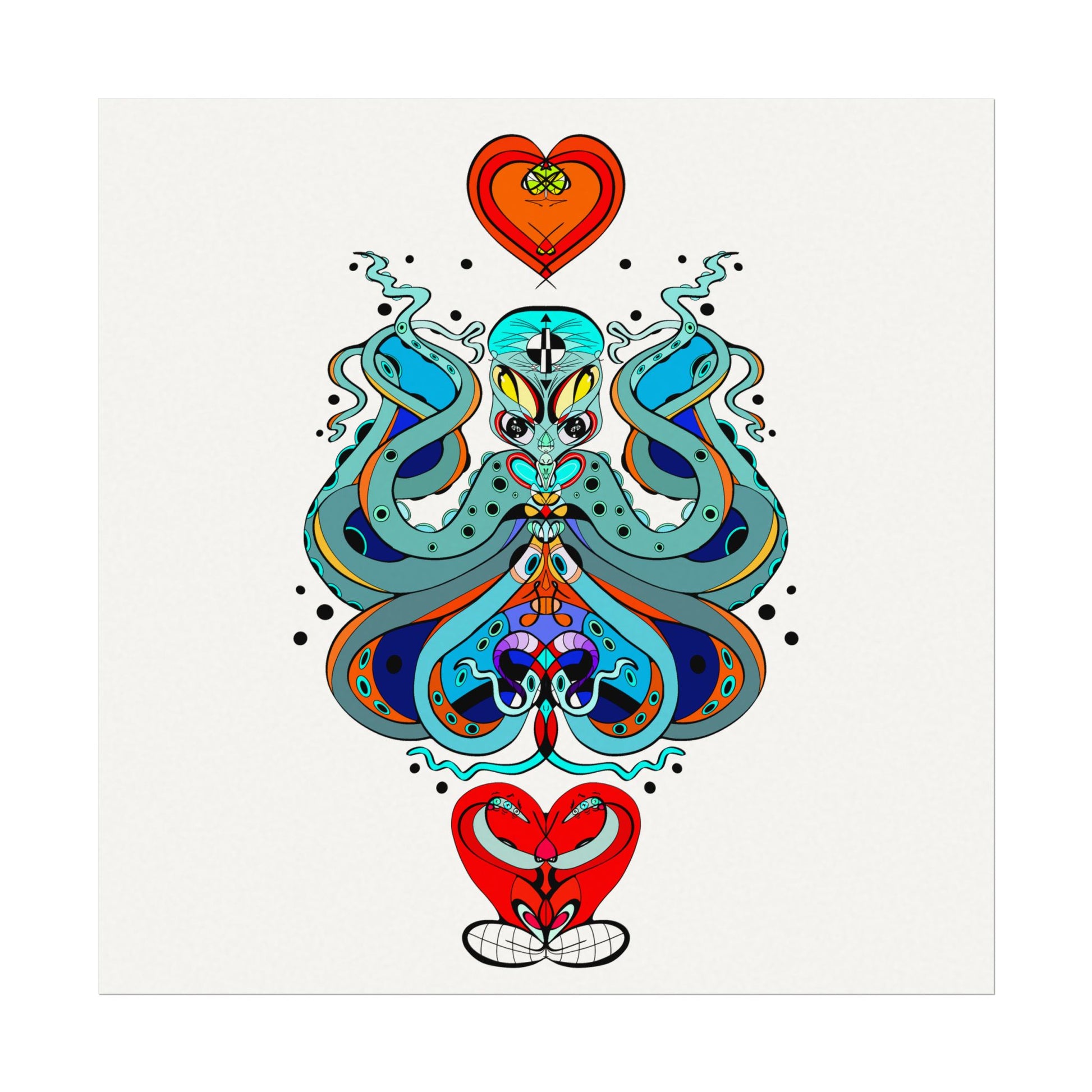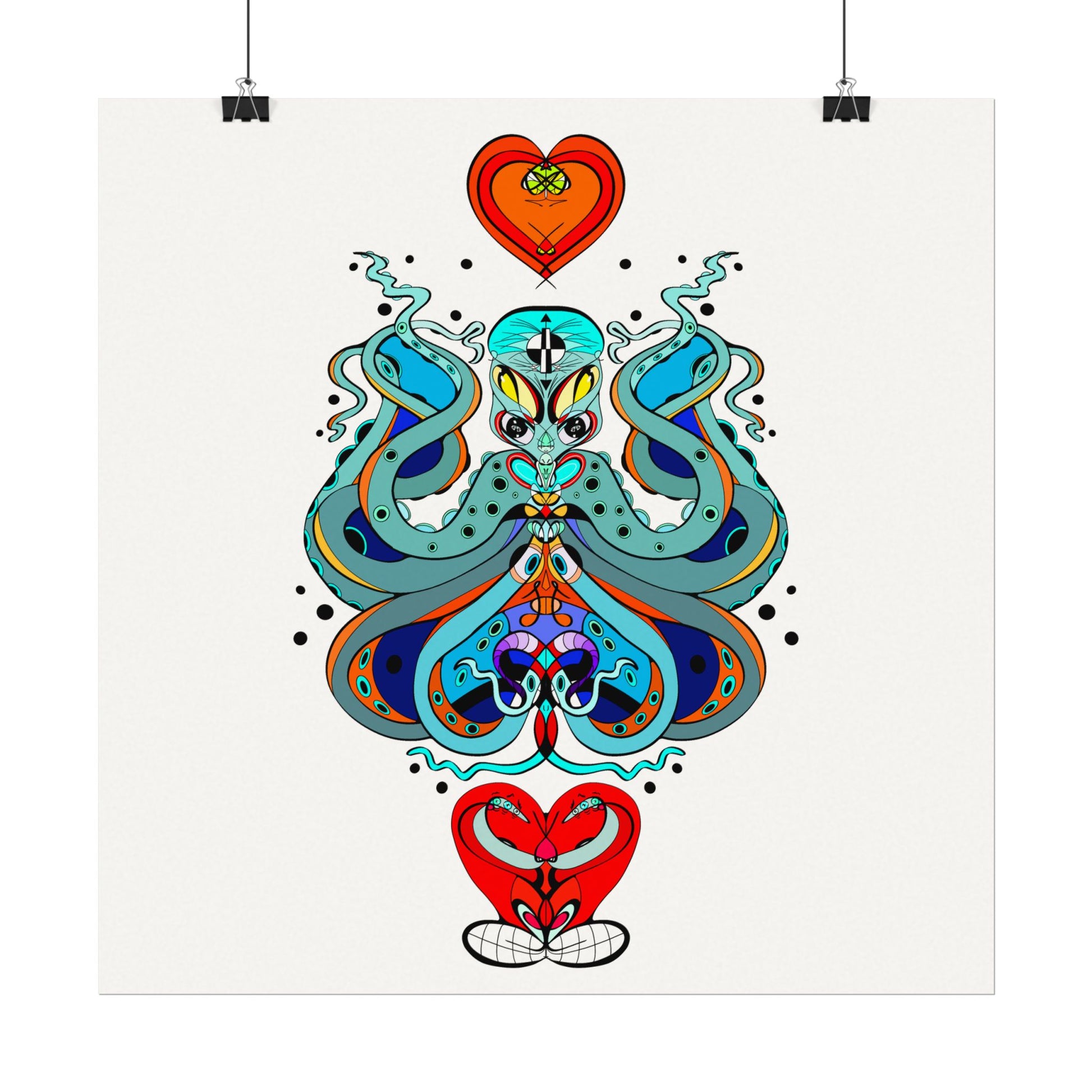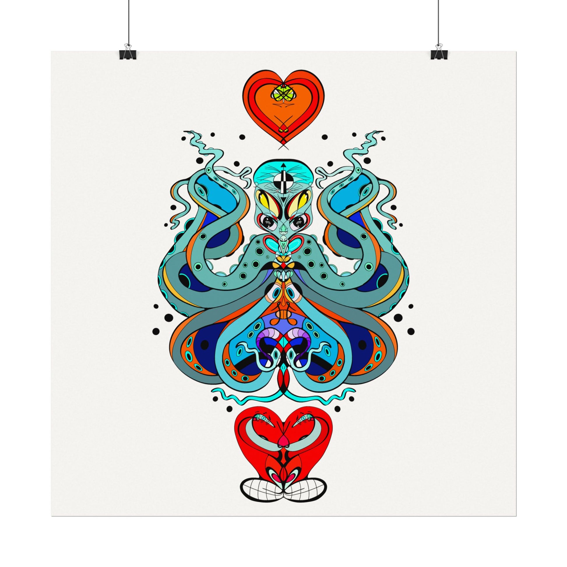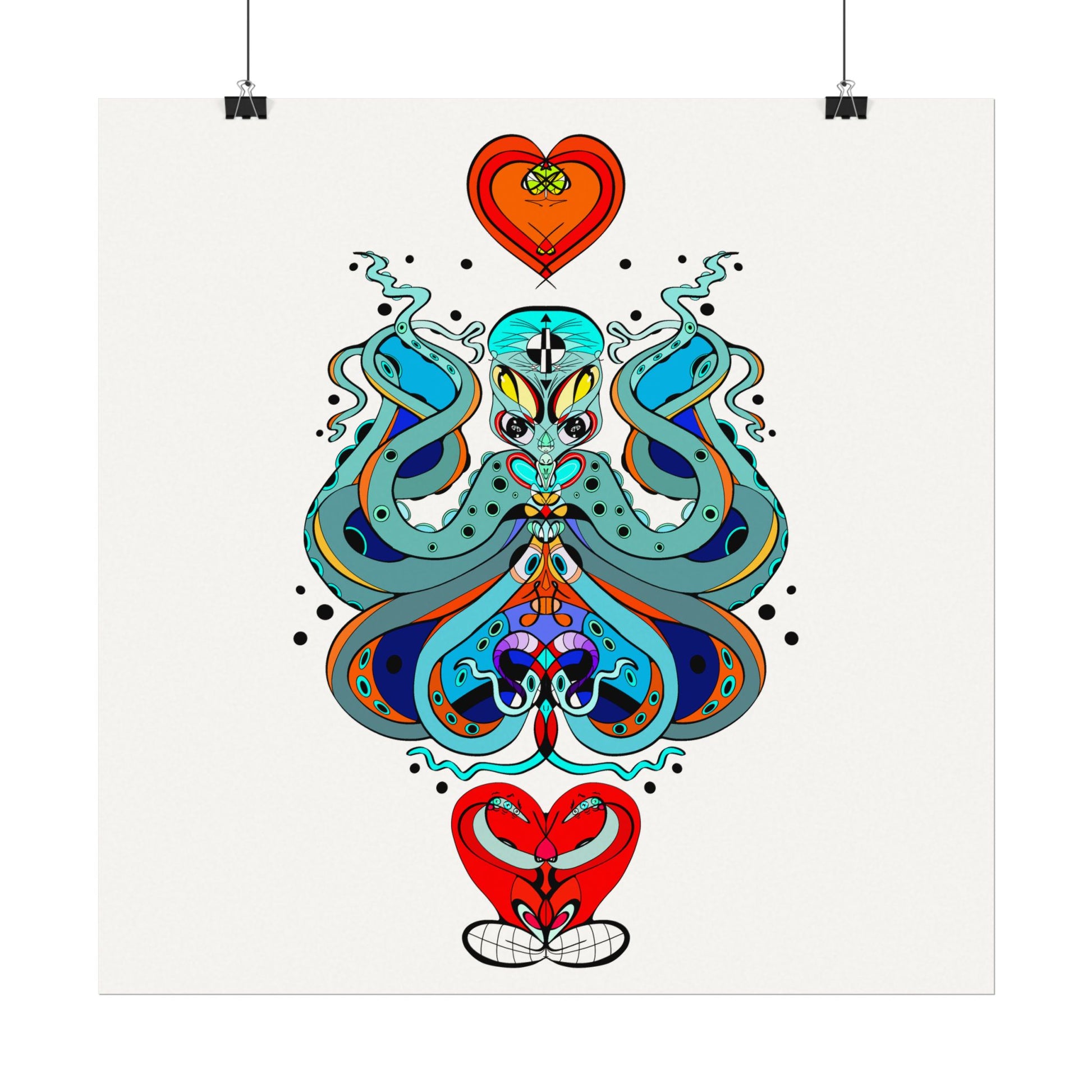 This textured watercolor matte poster brings bold, hand-drawn energy into a calm, gallery-ready form. Bright teals, deep blues and pops of red form a symmetrical, slightly mystical figure that feels both playful and meditative. Printed on heavyweight 285gsm textured watercolor paper with archival inks, the design keeps its painterly depth—subtle grain, velvety matte finish, and vivid color transitions that draw the eye without glare. Hang it in a reading nook, a creative studio, or a living room where curiosity and color are welcome. The artwork sits well surrounded by plants, mid-century furniture, or layered with other prints to create an eclectic wall cluster for a space that leans toward boho, modern folk, or contemporary spiritual aesthetics.