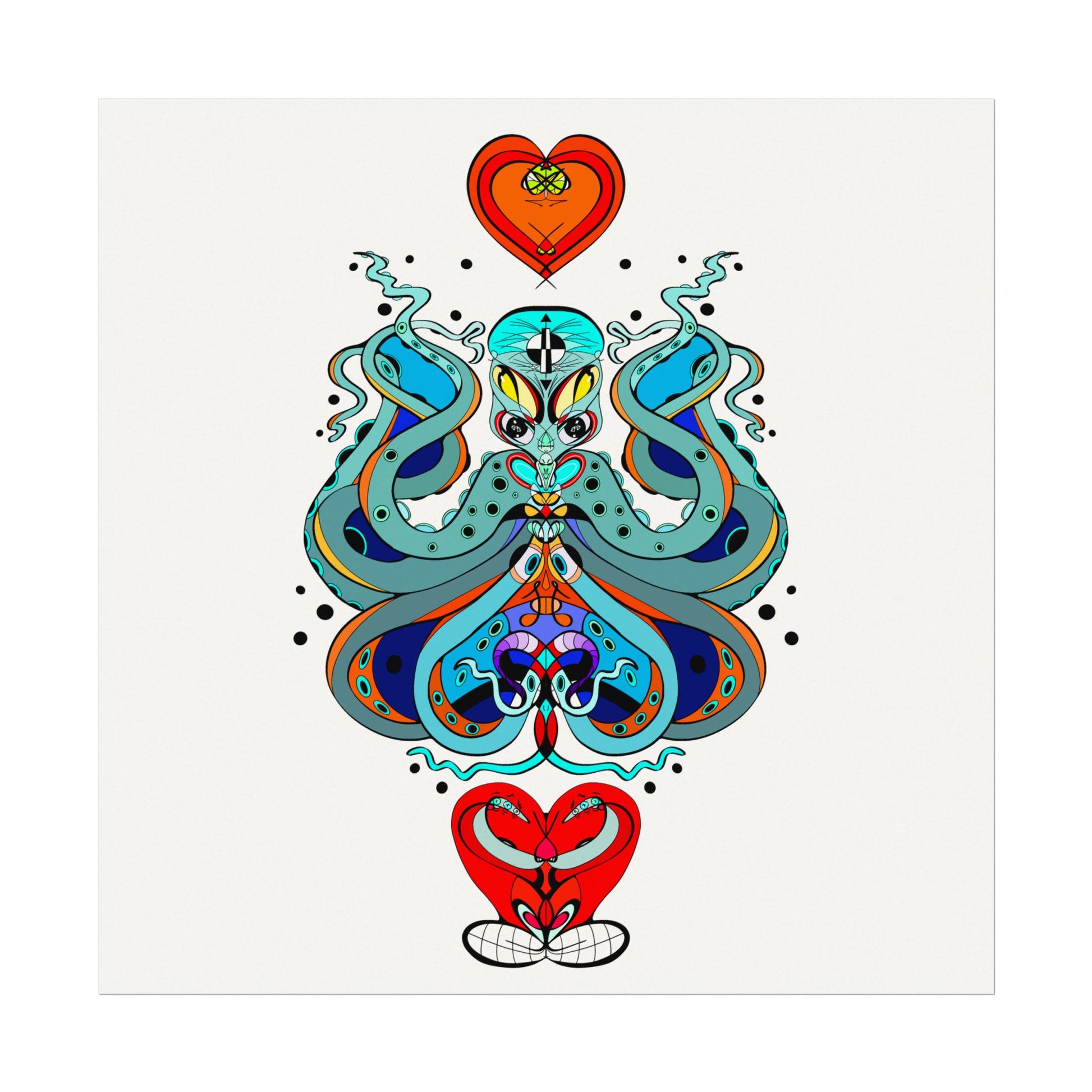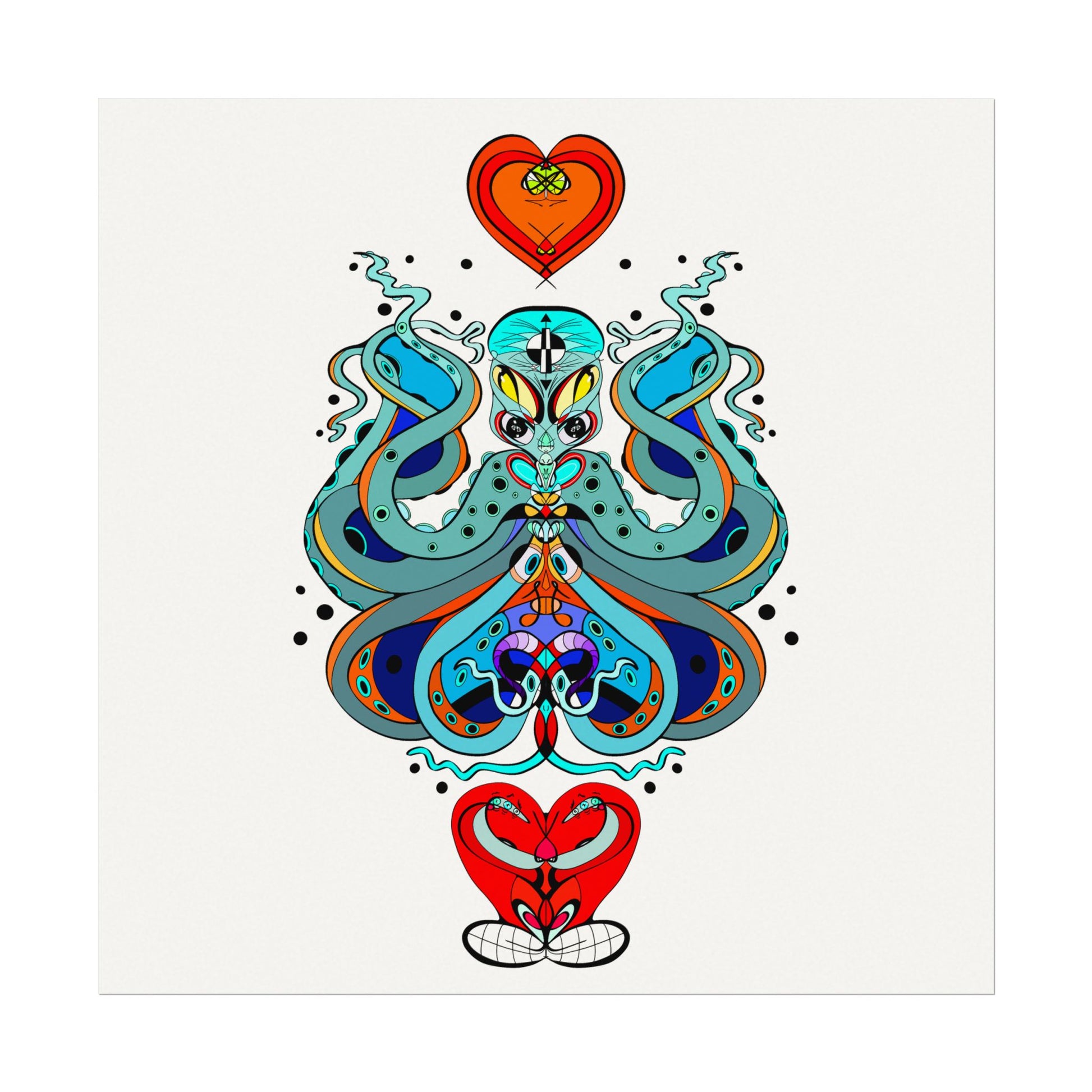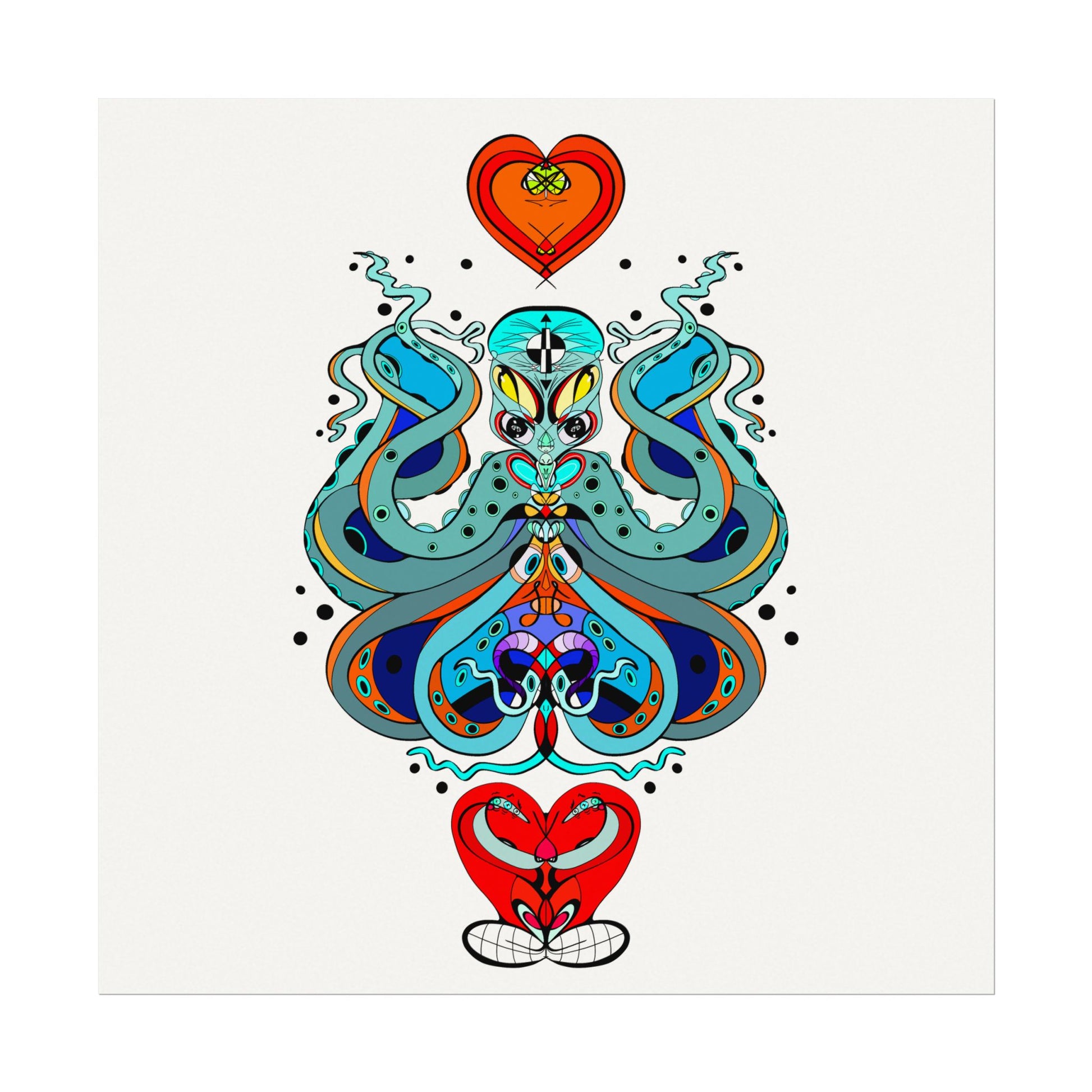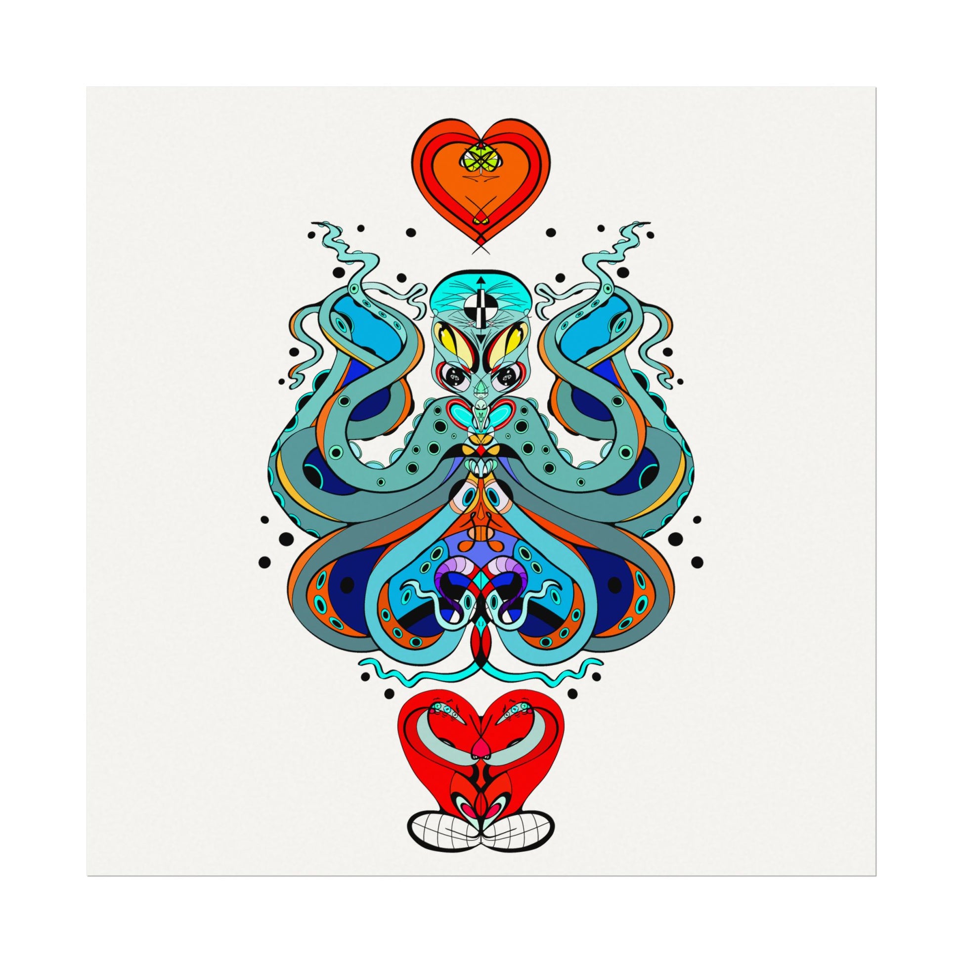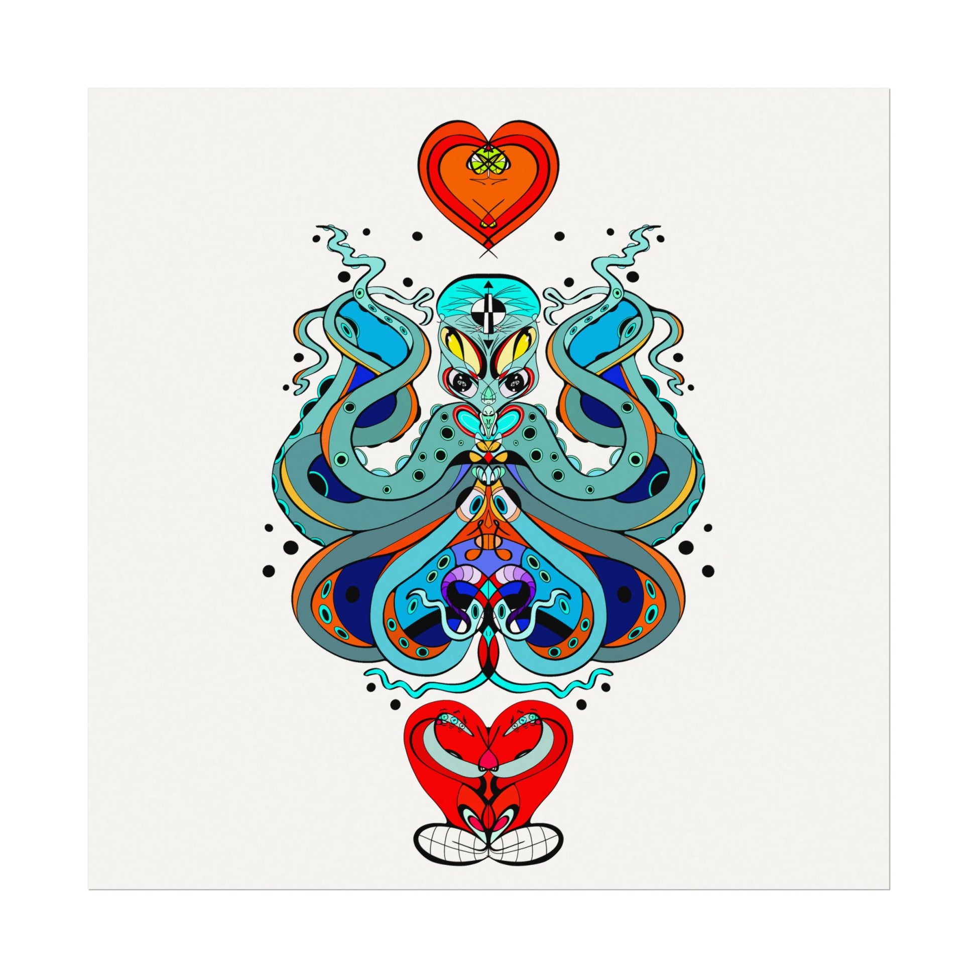 This textured watercolor matte poster brings bold, hand-drawn energy into a calm, gallery-ready form. Bright teals, deep blues and pops of red form a symmetrical, slightly mystical figure that feels both playful and meditative. Printed on heavyweight 285gsm textured watercolor paper with archival inks, the design keeps its painterly depth—subtle grain, velvety matte finish, and vivid color transitions that draw the eye without glare. Hang it in a reading nook, a creative studio, or a living room where curiosity and color are welcome. The artwork sits well surrounded by plants, mid-century furniture, or layered with other prints to create an eclectic wall cluster for a space that leans toward boho, modern folk, or contemporary spiritual aesthetics.