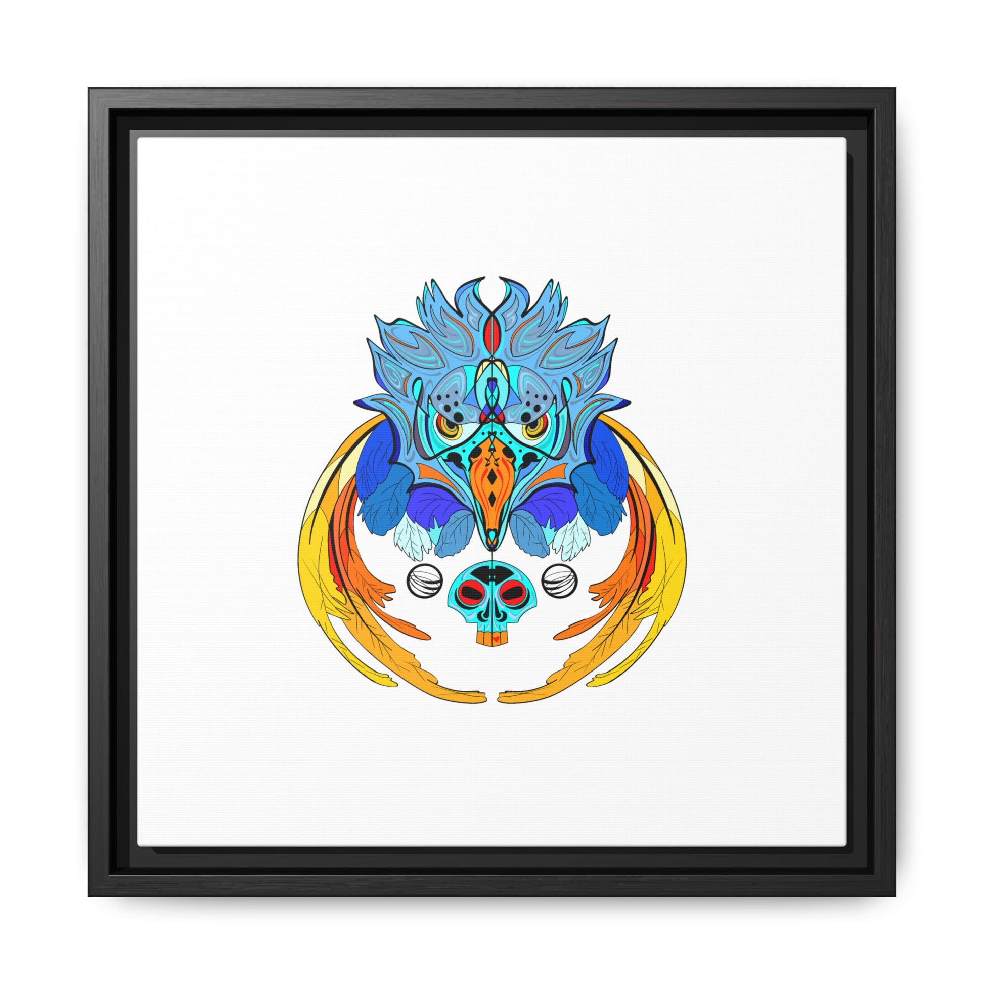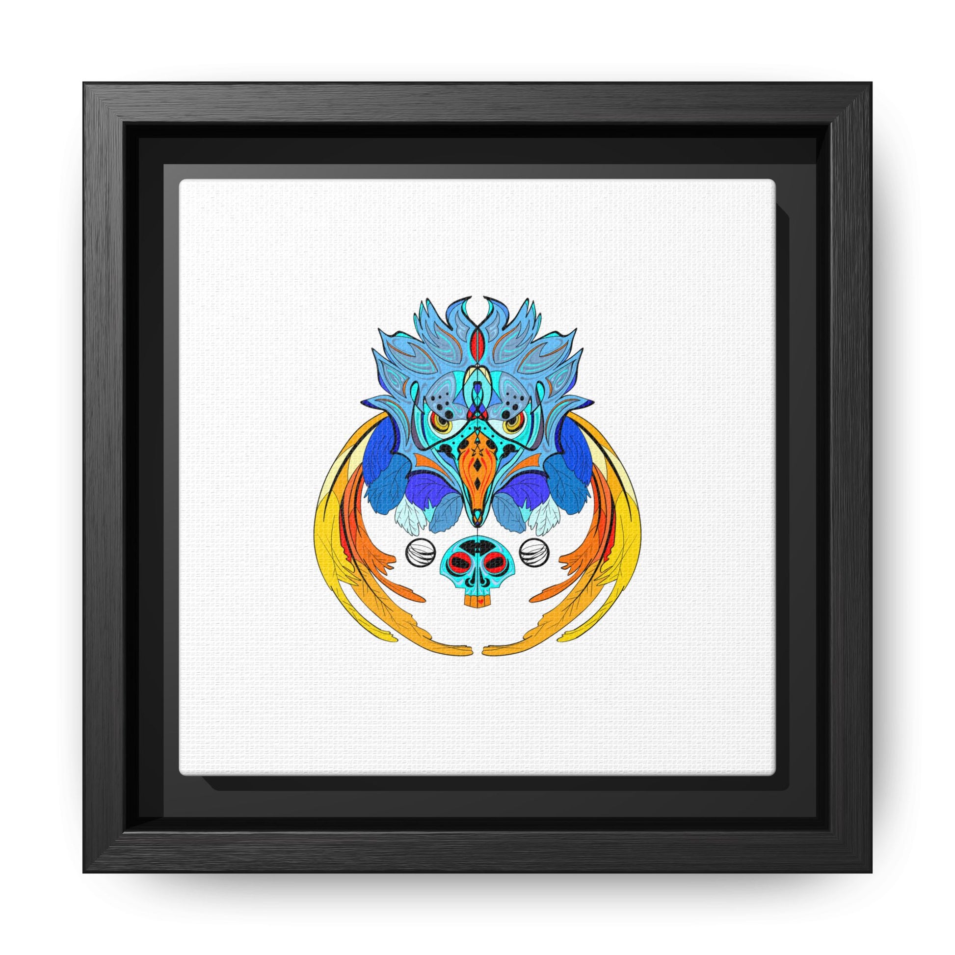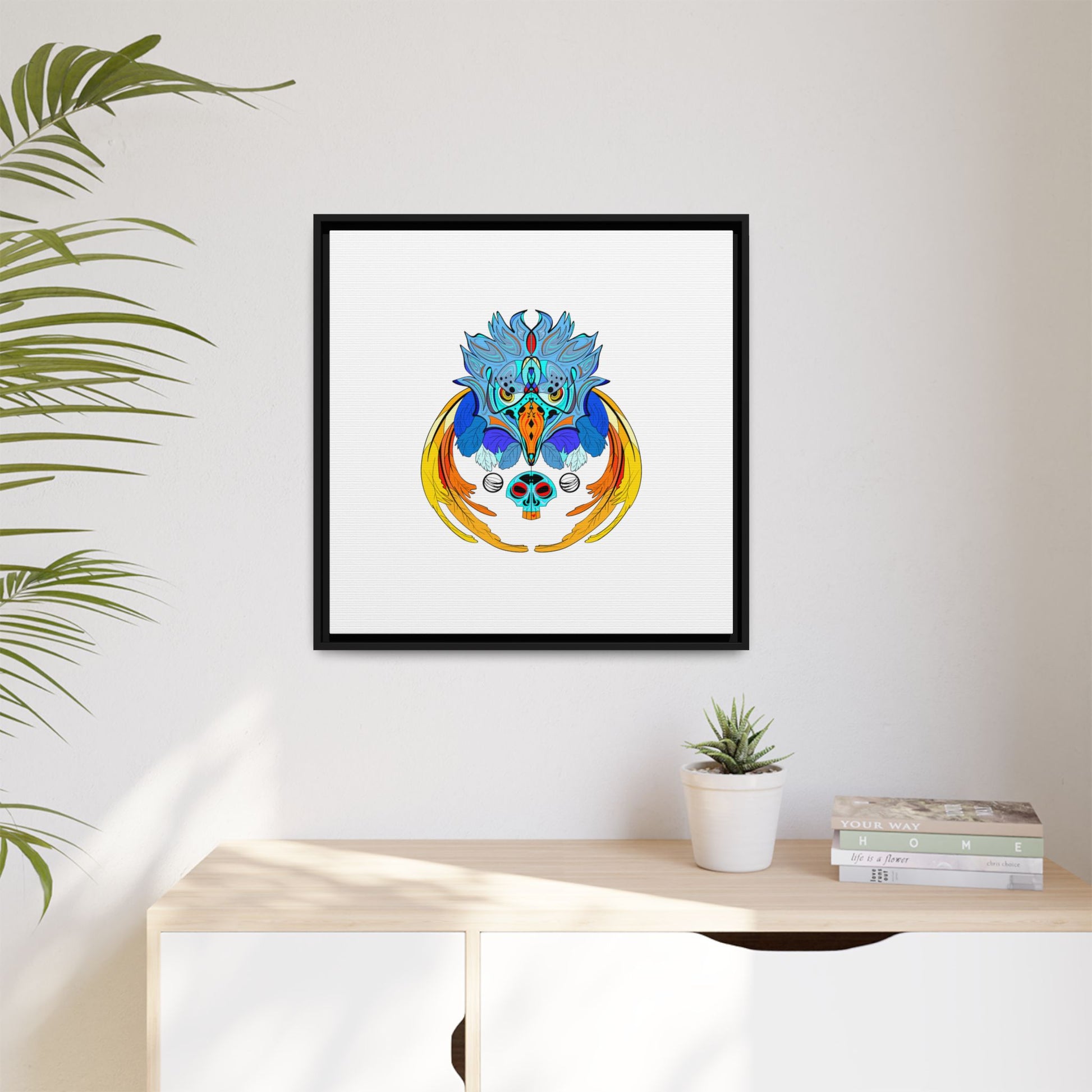 This matte canvas print, stretched on a slim pine frame and finished with a clean black edge, brings a bold pop of color and calm white space to your wall. The centered, vibrant illustration—rich blues, warm golds and crisp accents—sits on a luxuriously smooth matte surface that reduces glare and puts the focus on every drawn detail. The lightweight, sustainably sourced pine frame keeps the profile modern and gallery-ready. Hang it alone for a subtle statement or pair with other minimalist pieces to create a curated nook that feels thoughtful, bright, and a little bit magical.