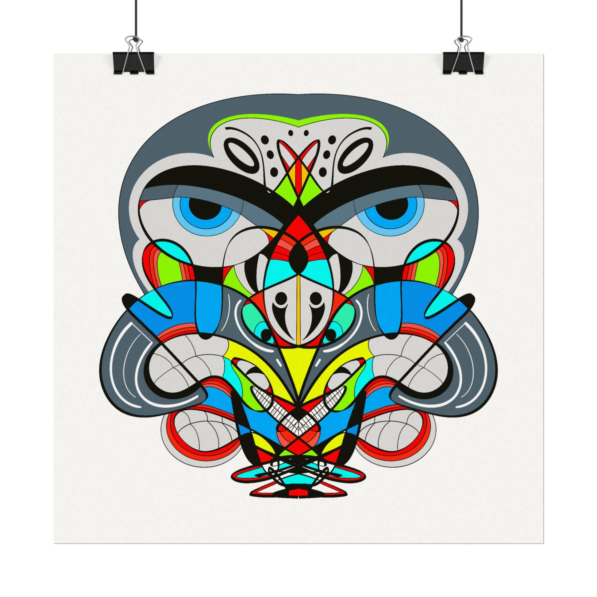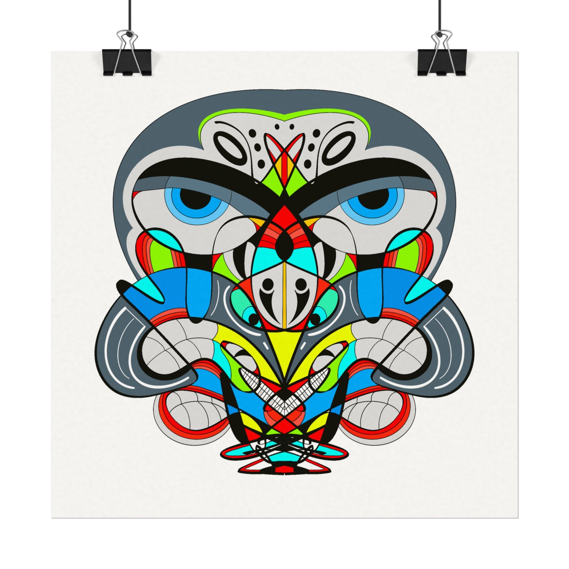 The composition feels both primitive and contemporary: symmetrical shapes form an expressive face that invites closer inspection. That intimacy makes the poster suited to creators, collectors, and anyone who values spirited, conversation-starting artwork for living spaces, offices, or art nooks. Because it’s available in many sizes and orientations, you can scale it for a small vignette or a bold statement piece without losing the paper’s beautiful texture.