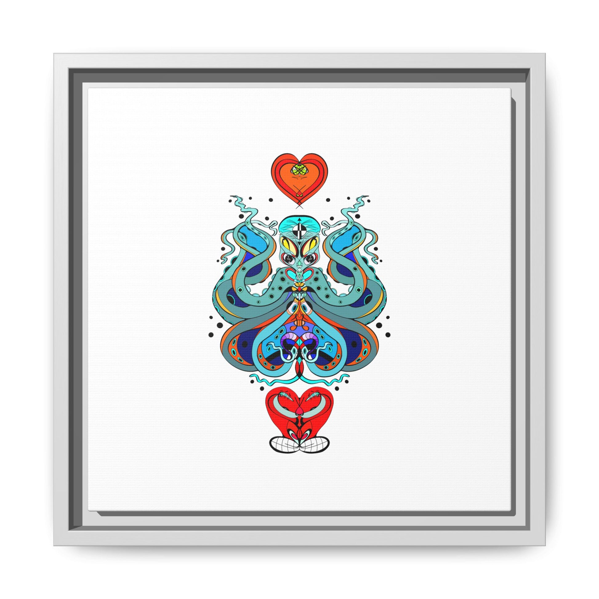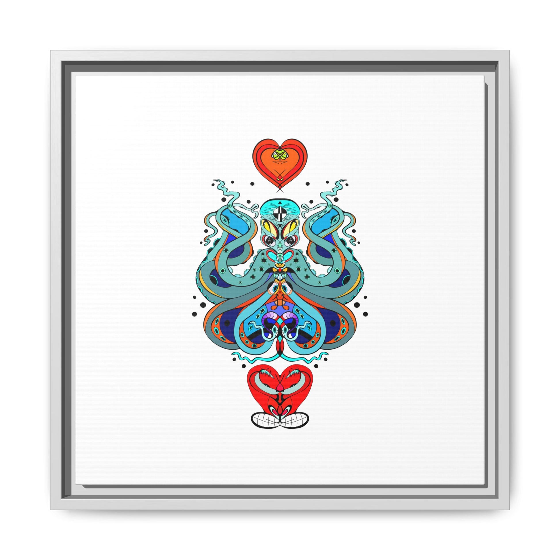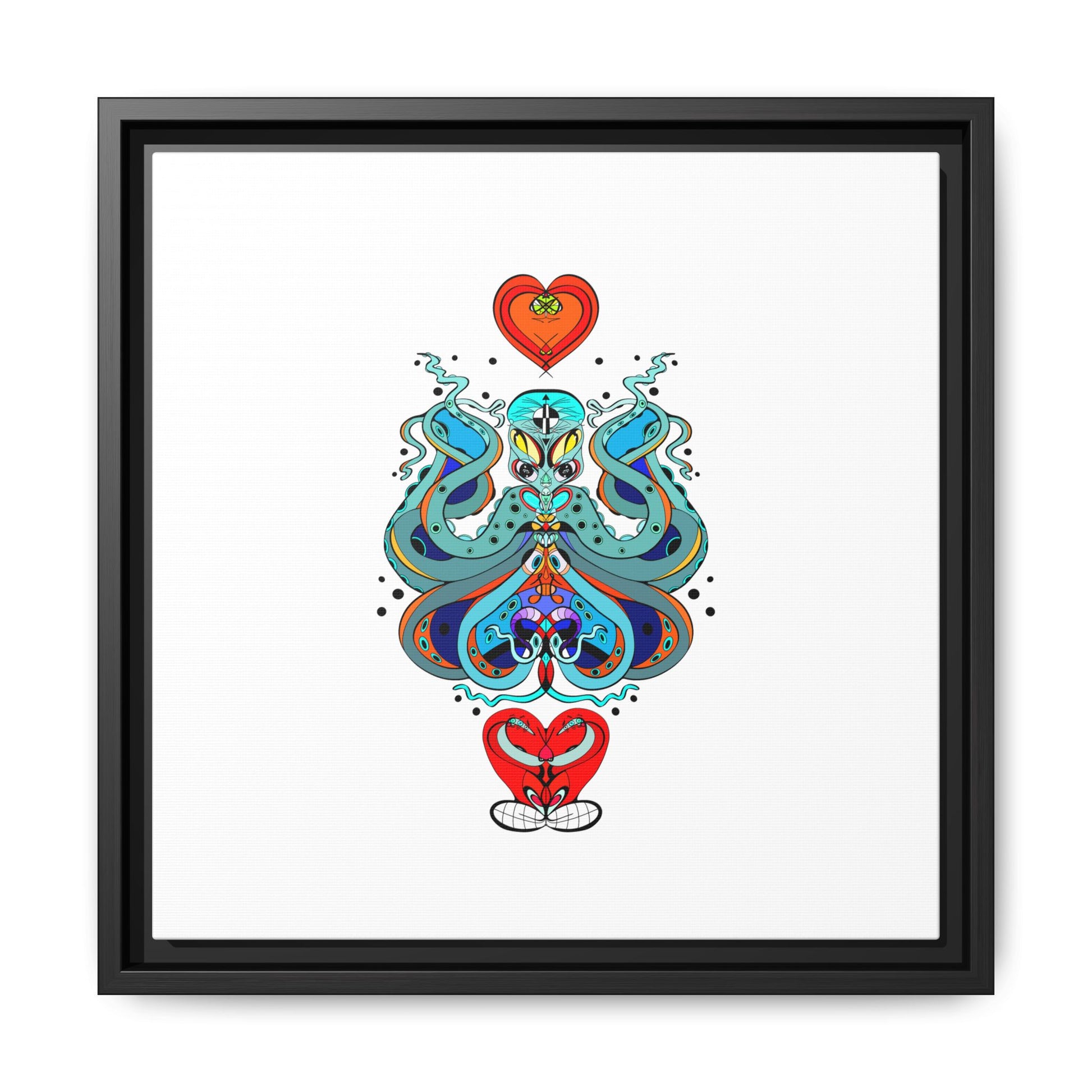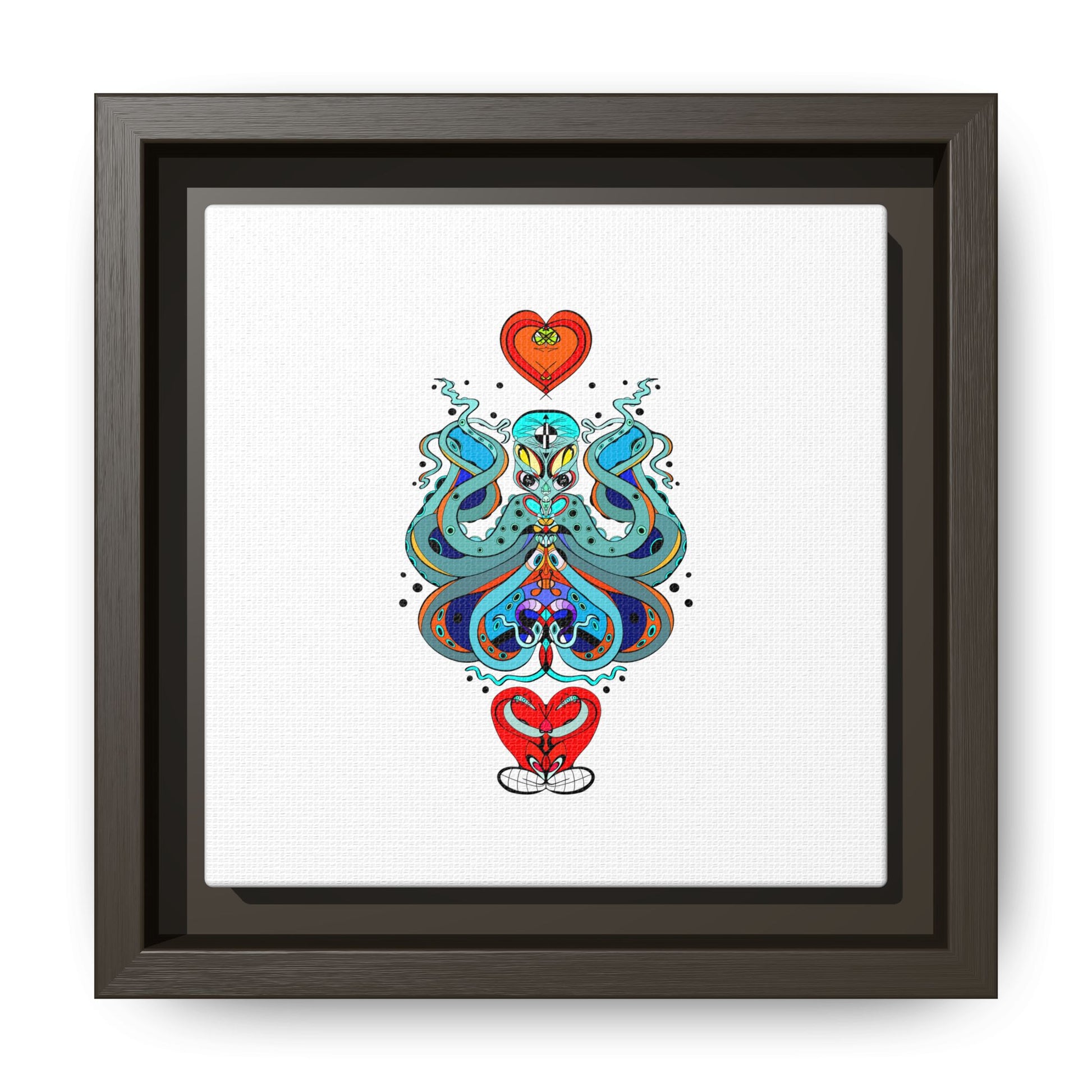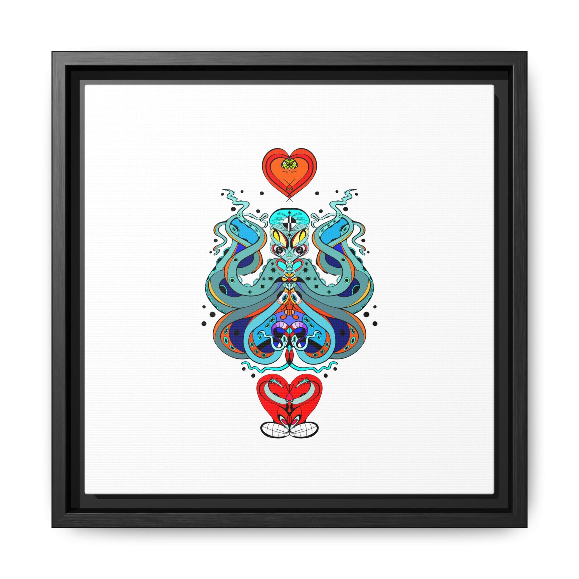 A framed matte canvas print that brings playful, modern folk art into calm, curated spaces. Bright, layered colors and crisp linework sit on a clean white field, letting the whimsical mirrored motif breathe. The slim black frame and matte finish create a quiet, gallery-ready presence — bold without shouting. Hang it alone for a focused statement, or pair it with other minimalist pieces to add a pop of personality to a living room, hallway, or creative studio.