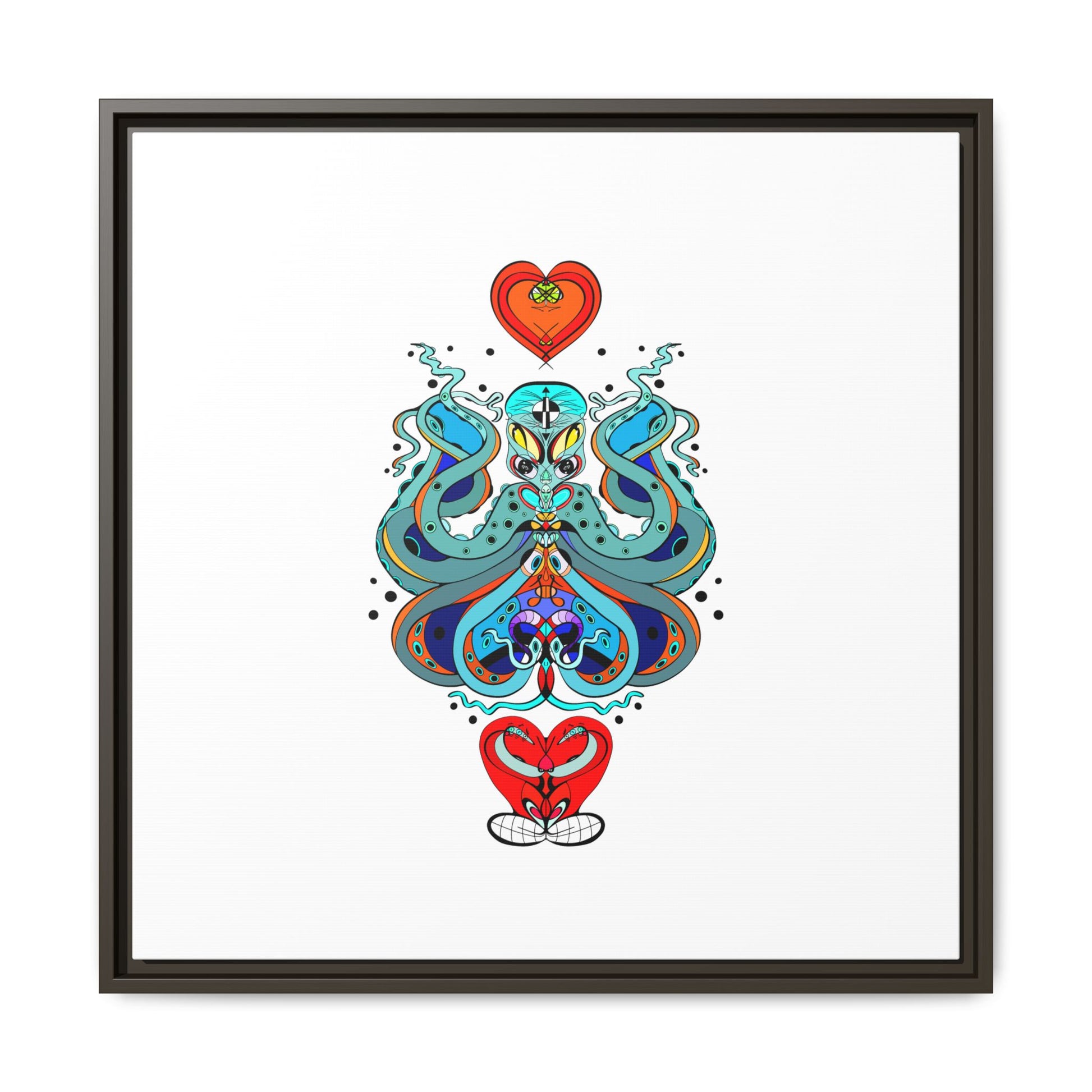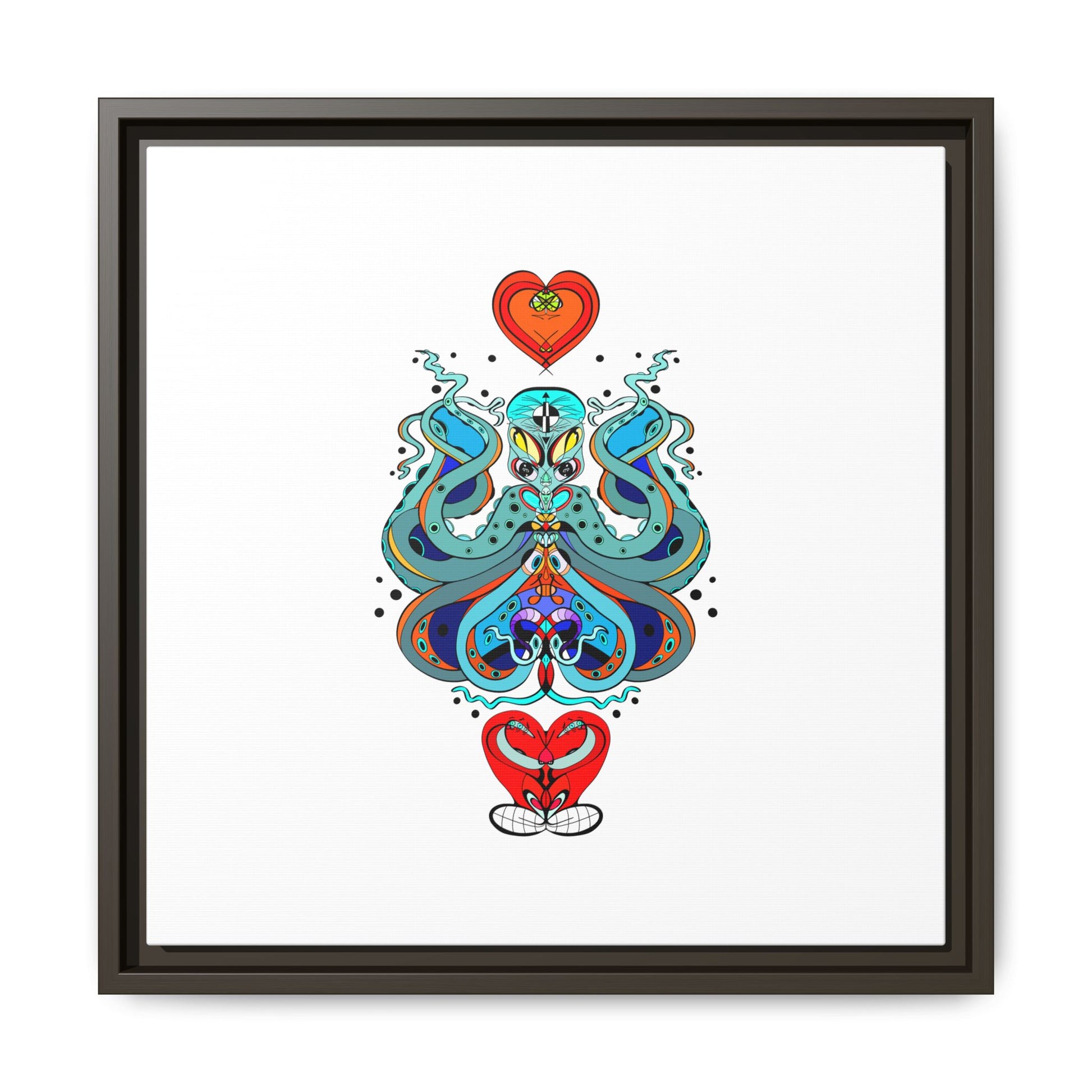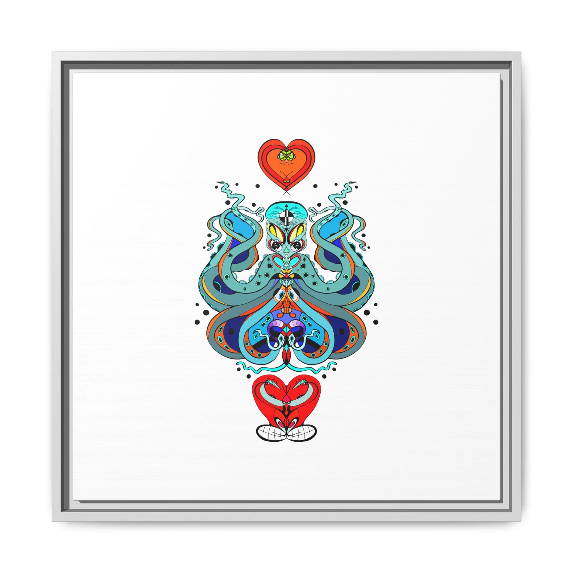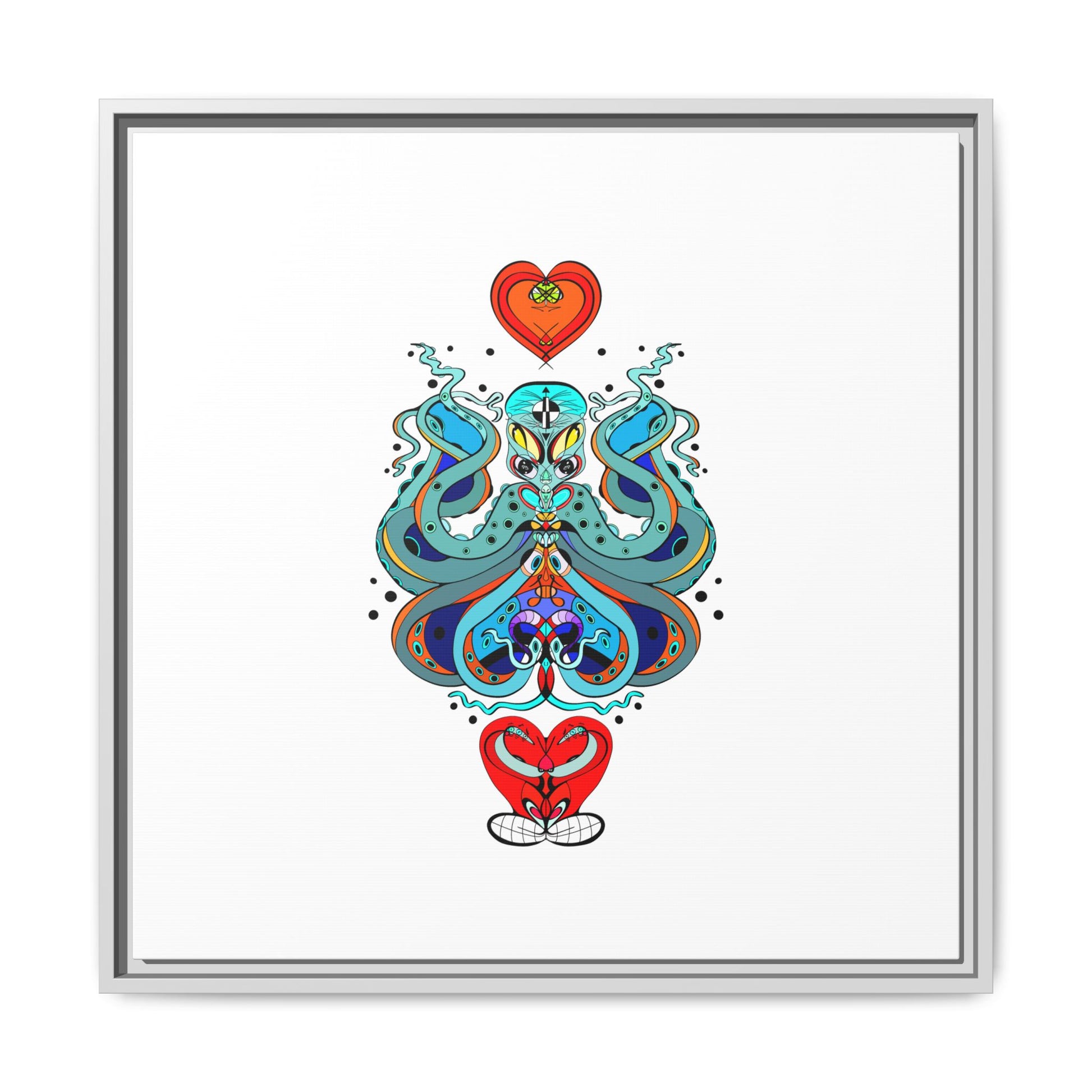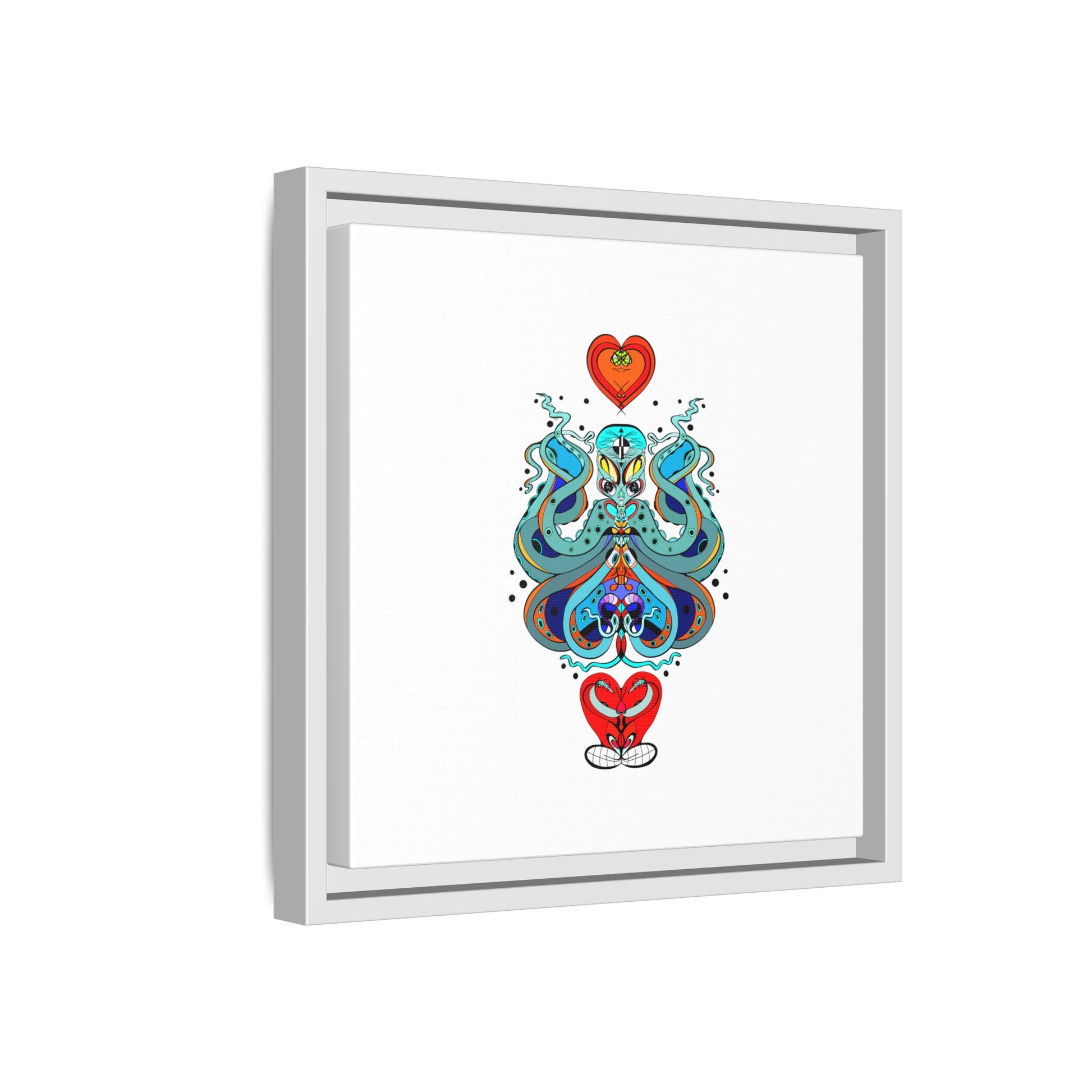 A framed matte canvas print that brings playful, modern folk art into calm, curated spaces. Bright, layered colors and crisp linework sit on a clean white field, letting the whimsical mirrored motif breathe. The slim black frame and matte finish create a quiet, gallery-ready presence — bold without shouting. Hang it alone for a focused statement, or pair it with other minimalist pieces to add a pop of personality to a living room, hallway, or creative studio.