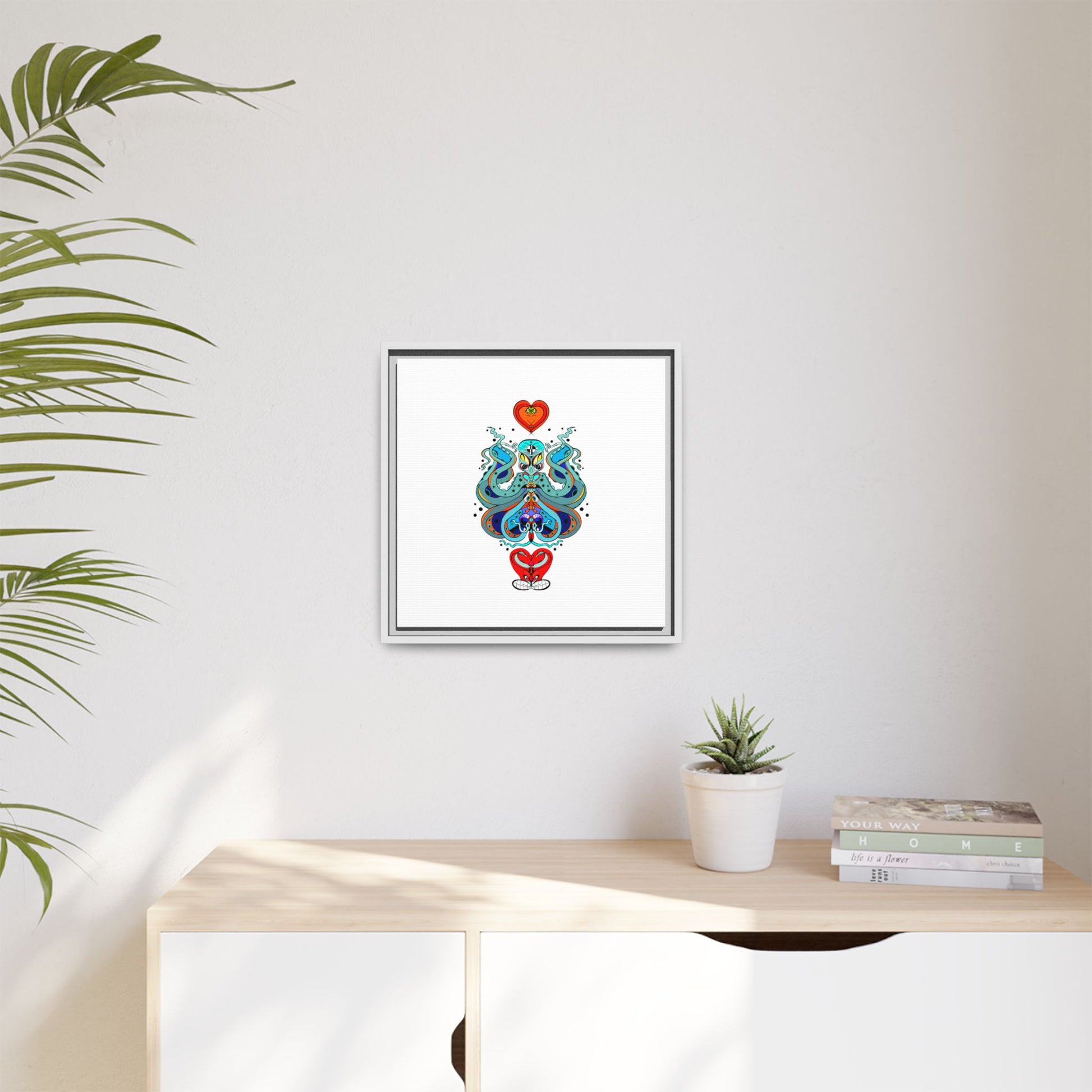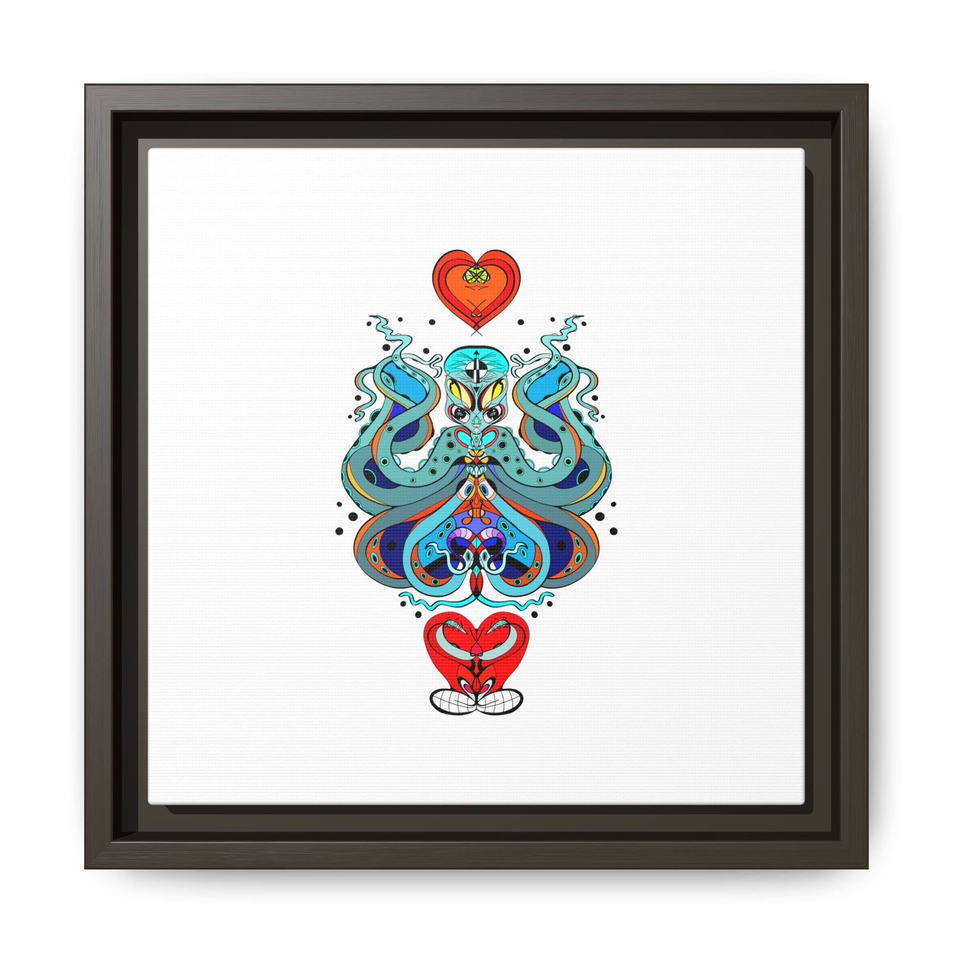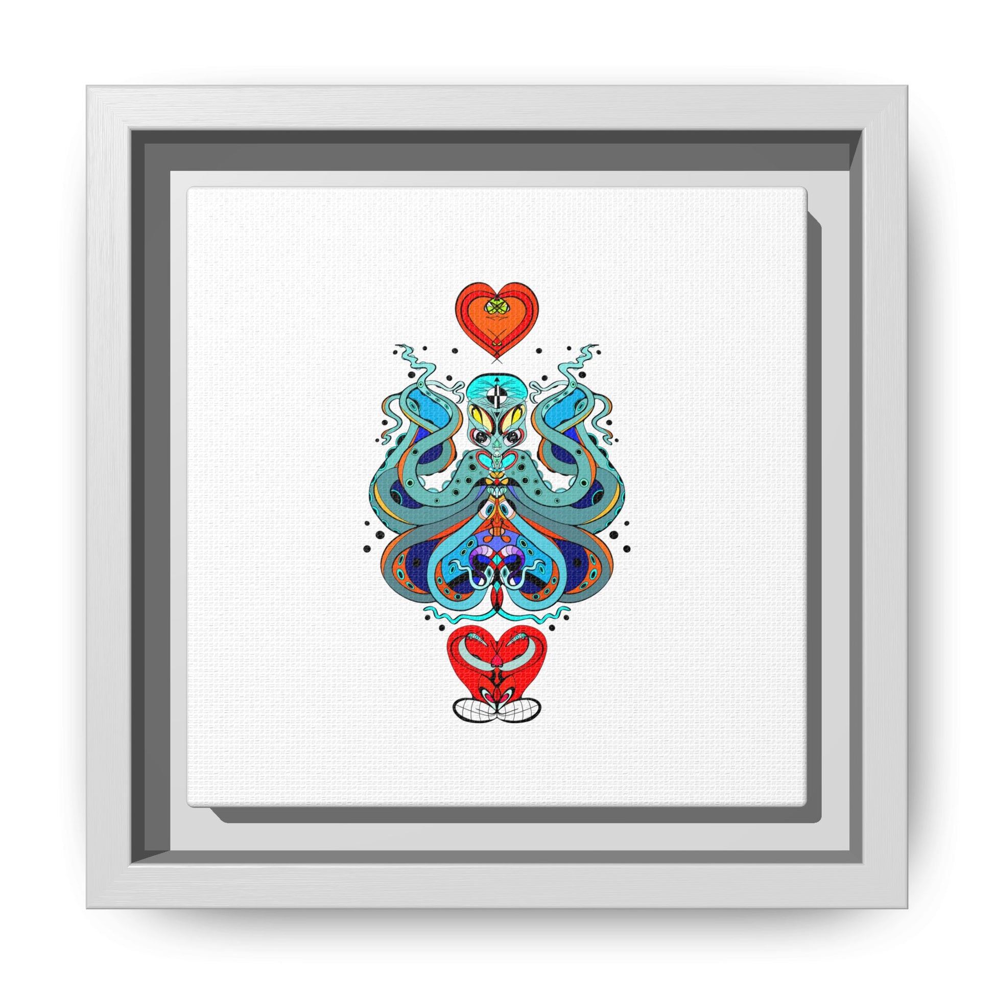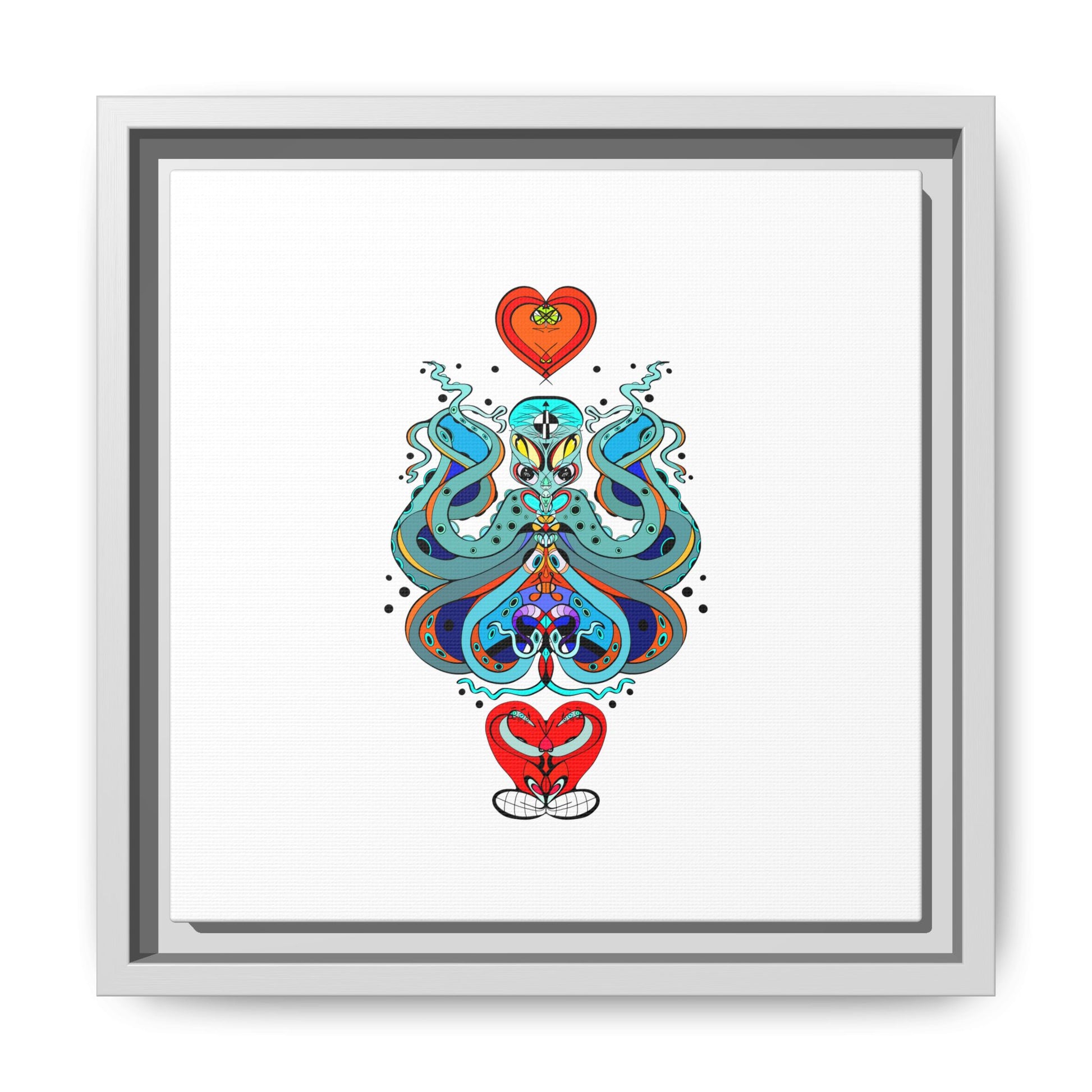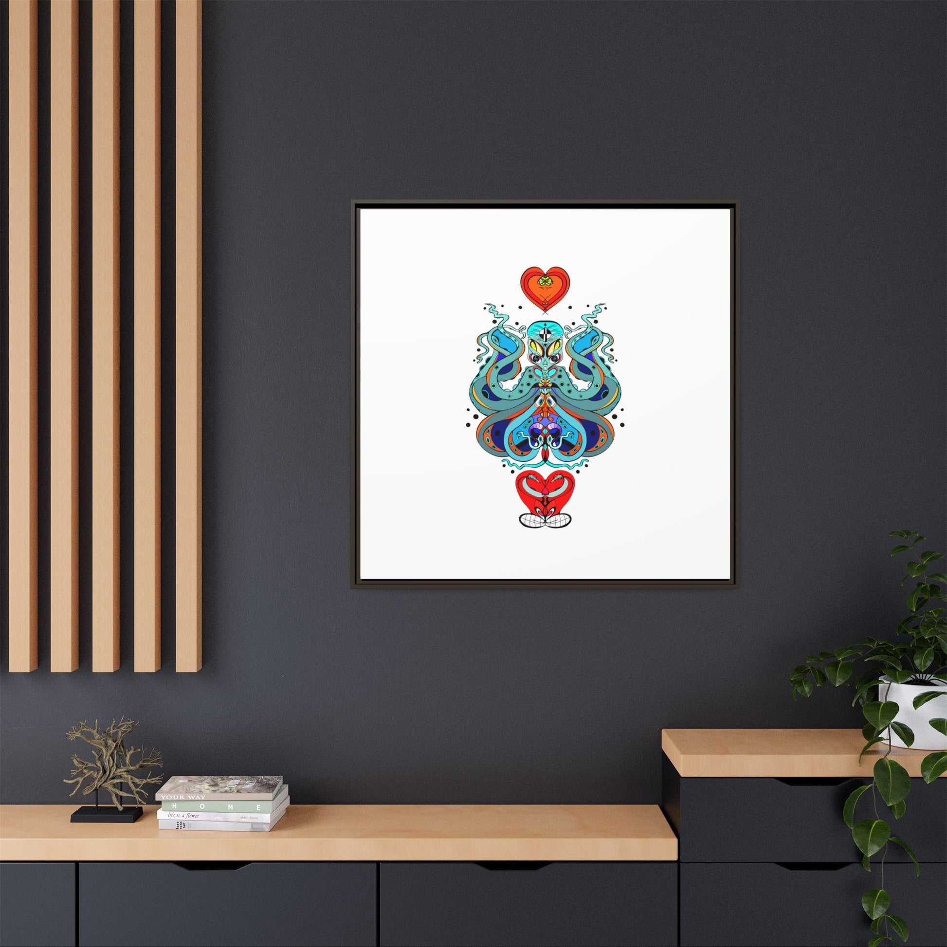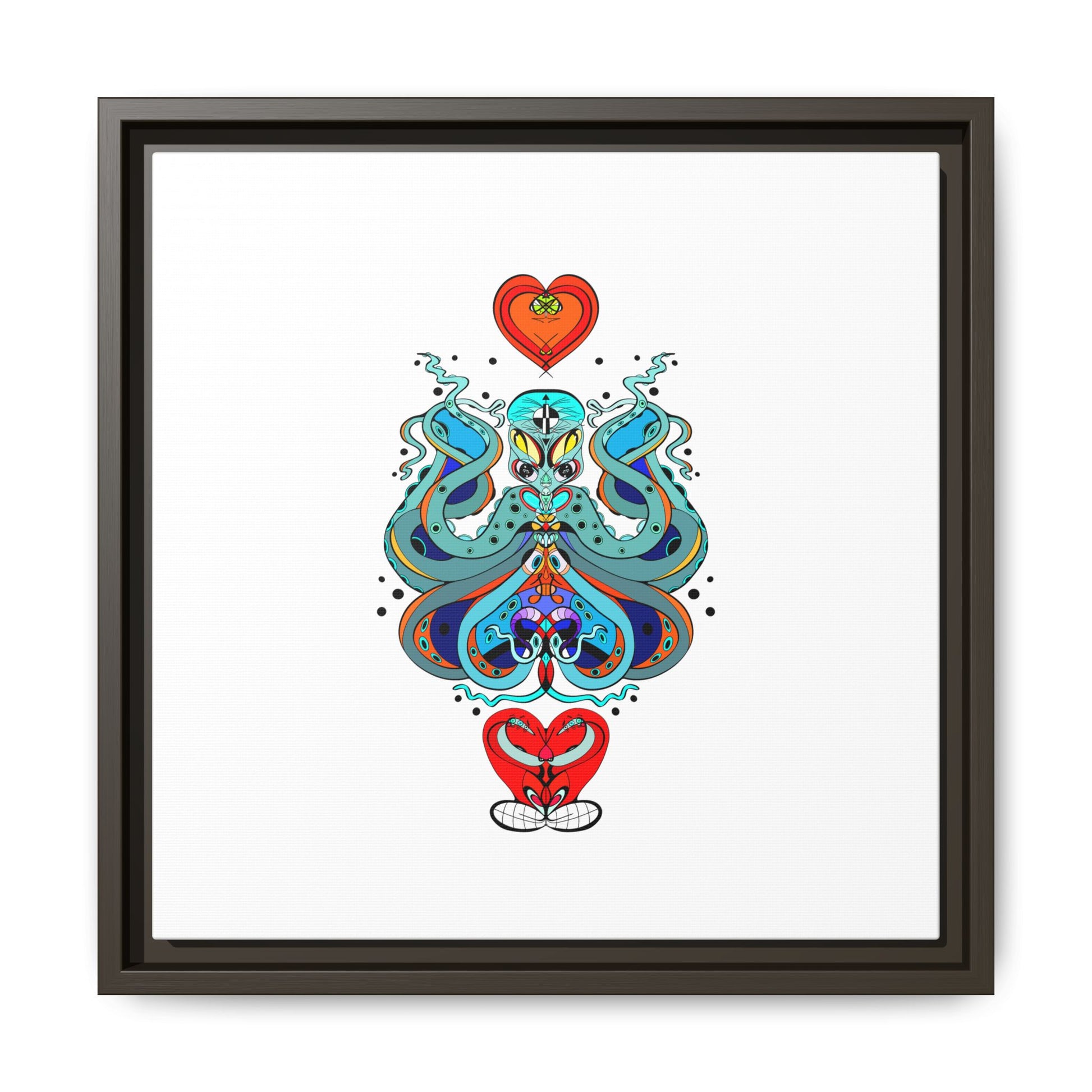 A framed matte canvas print that brings playful, modern folk art into calm, curated spaces. Bright, layered colors and crisp linework sit on a clean white field, letting the whimsical mirrored motif breathe. The slim black frame and matte finish create a quiet, gallery-ready presence — bold without shouting. Hang it alone for a focused statement, or pair it with other minimalist pieces to add a pop of personality to a living room, hallway, or creative studio.