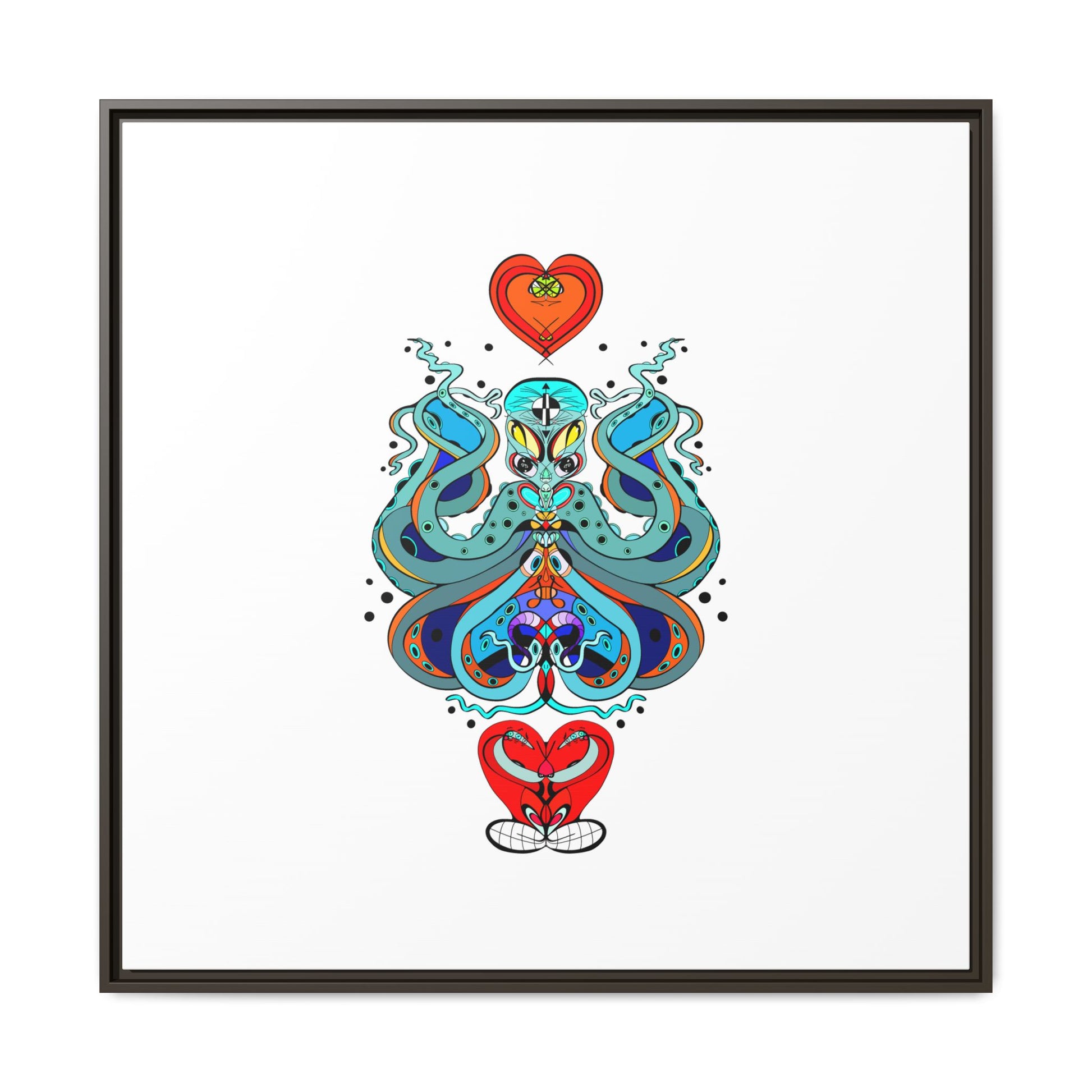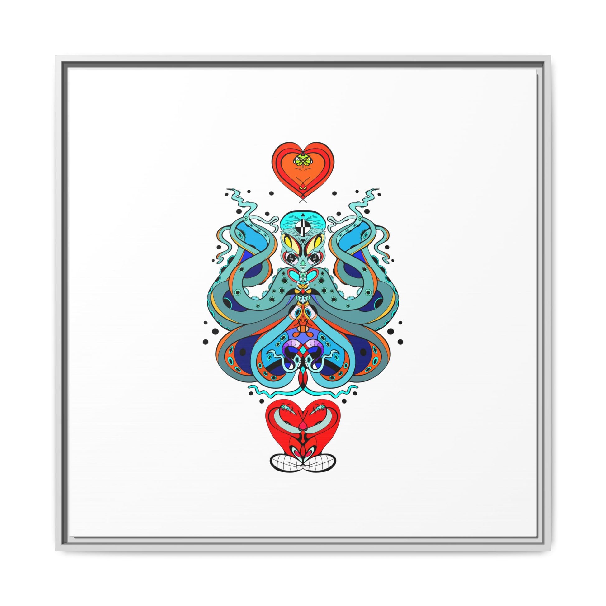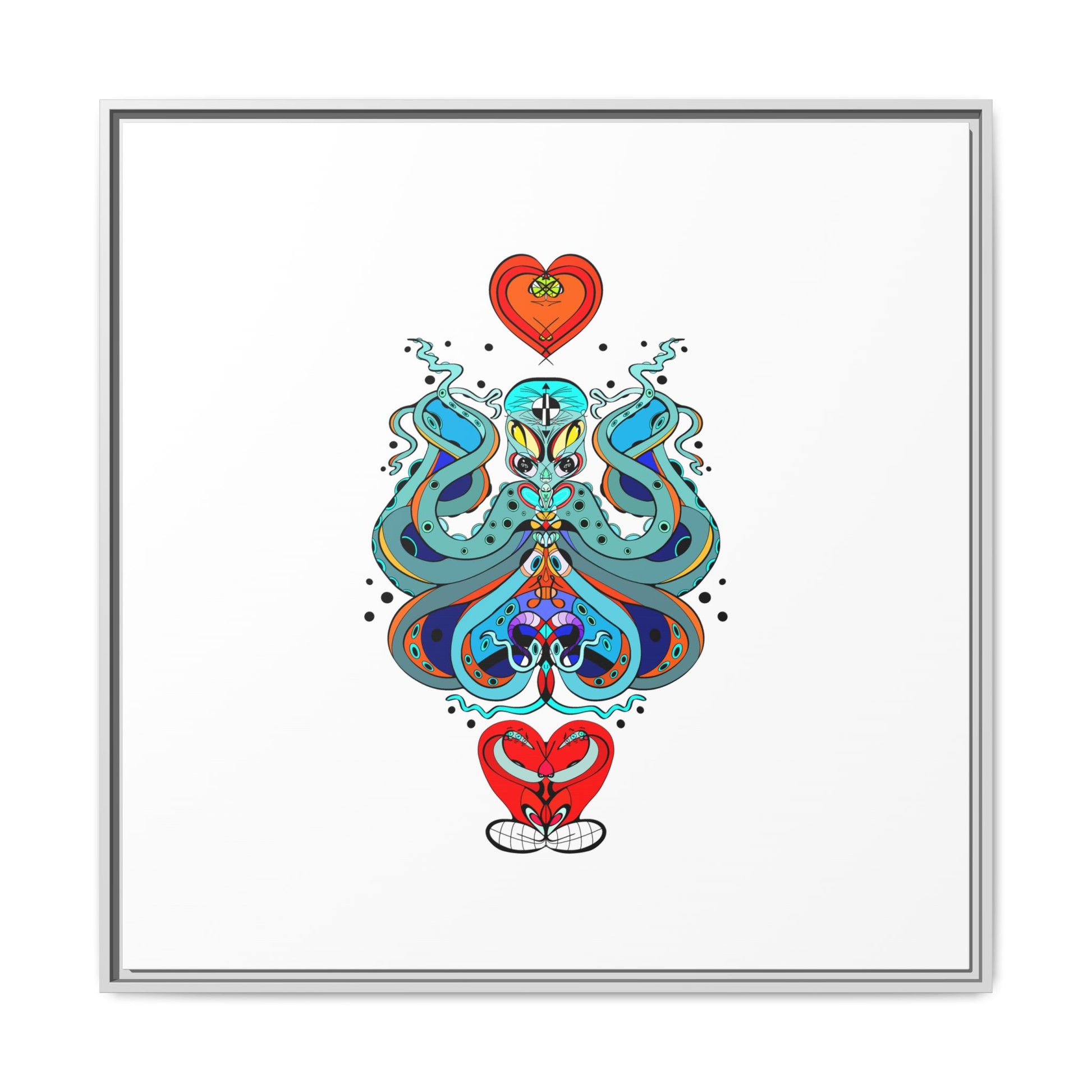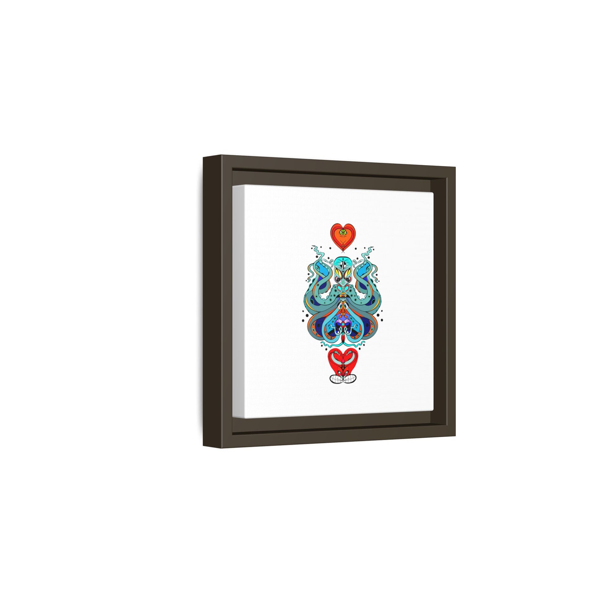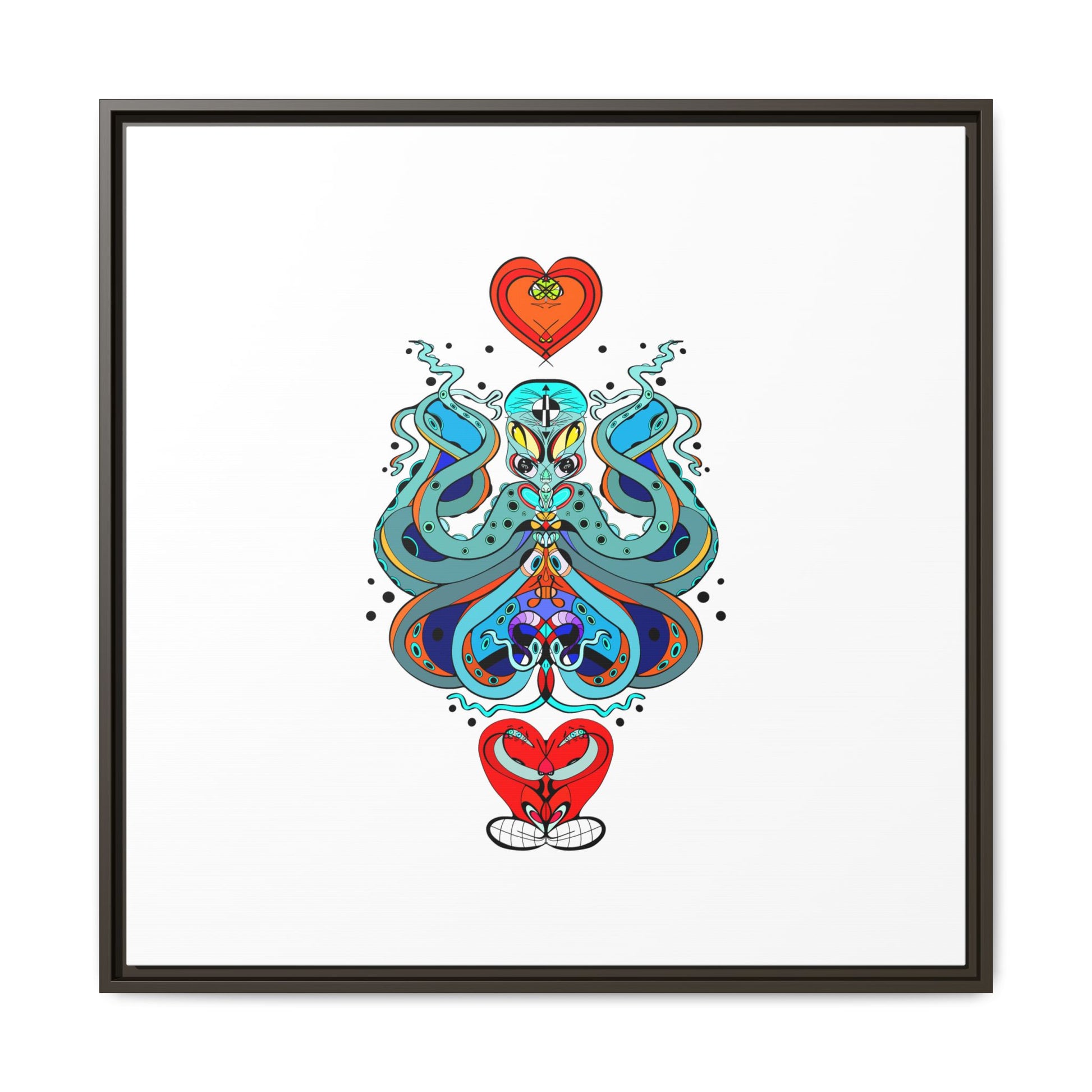 A framed matte canvas print that brings playful, modern folk art into calm, curated spaces. Bright, layered colors and crisp linework sit on a clean white field, letting the whimsical mirrored motif breathe. The slim black frame and matte finish create a quiet, gallery-ready presence — bold without shouting. Hang it alone for a focused statement, or pair it with other minimalist pieces to add a pop of personality to a living room, hallway, or creative studio.