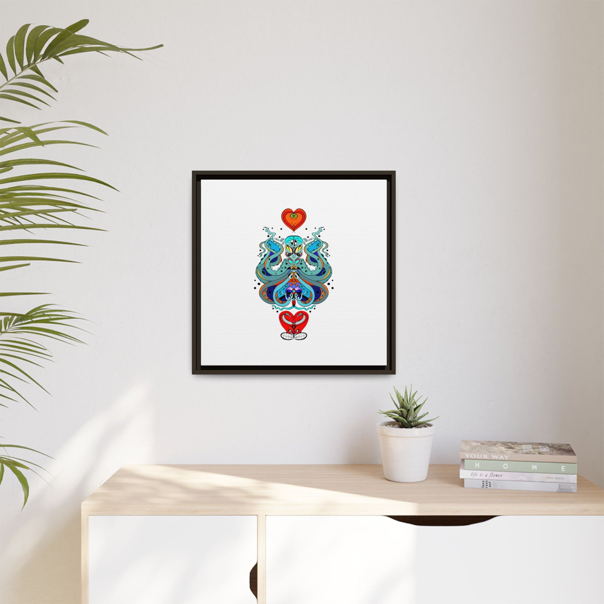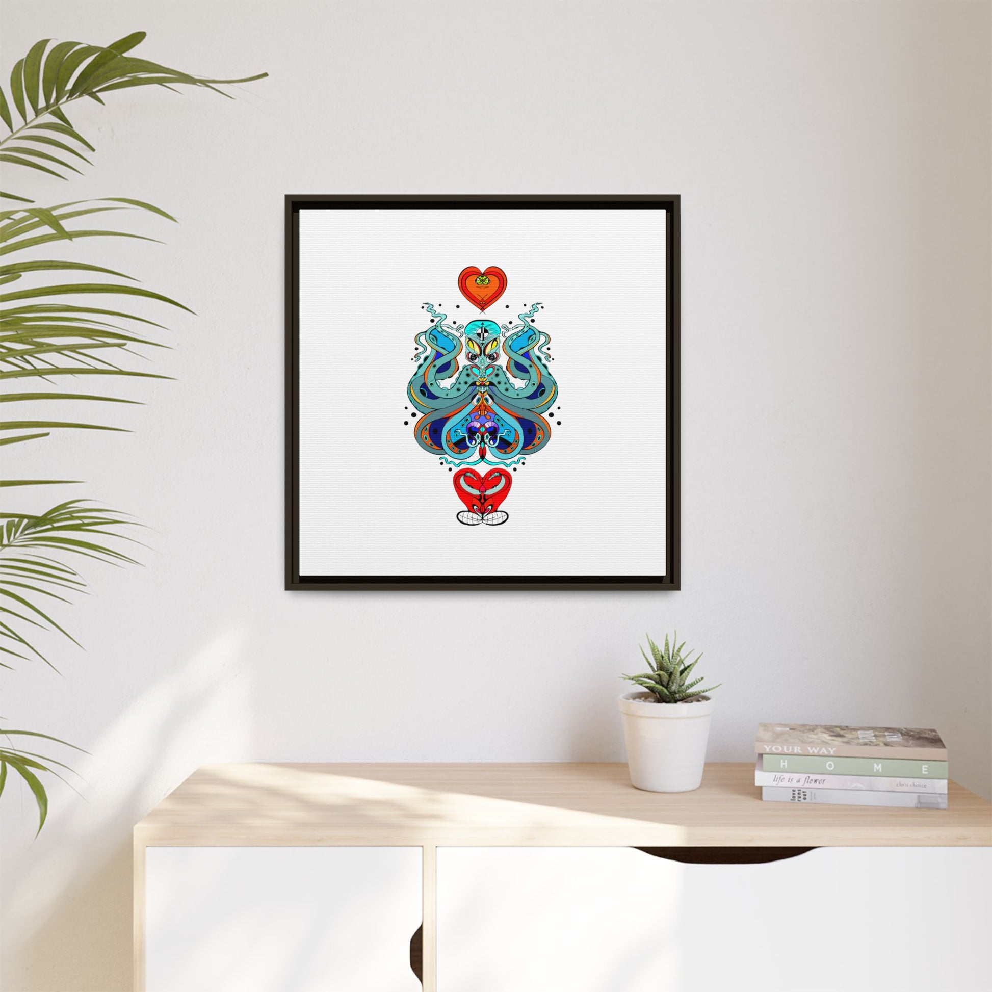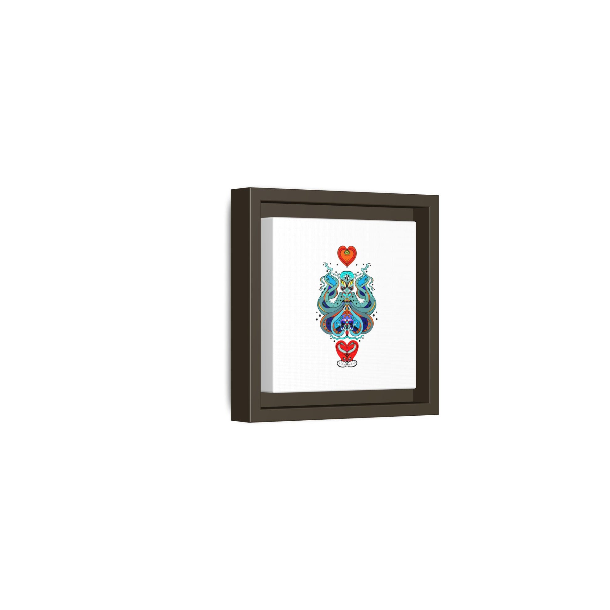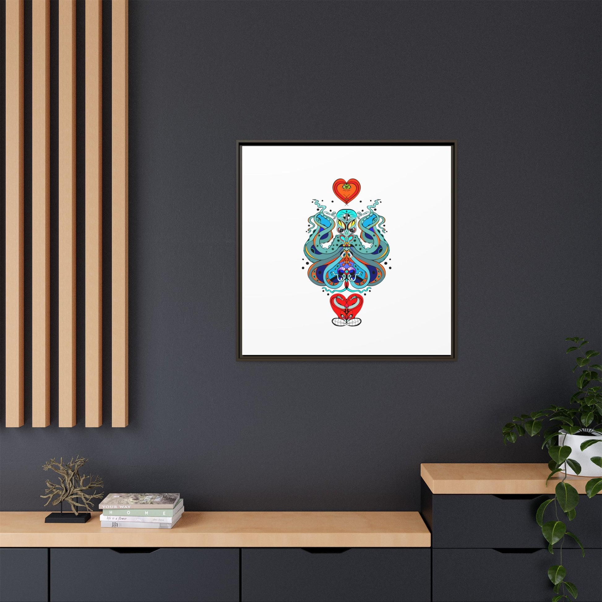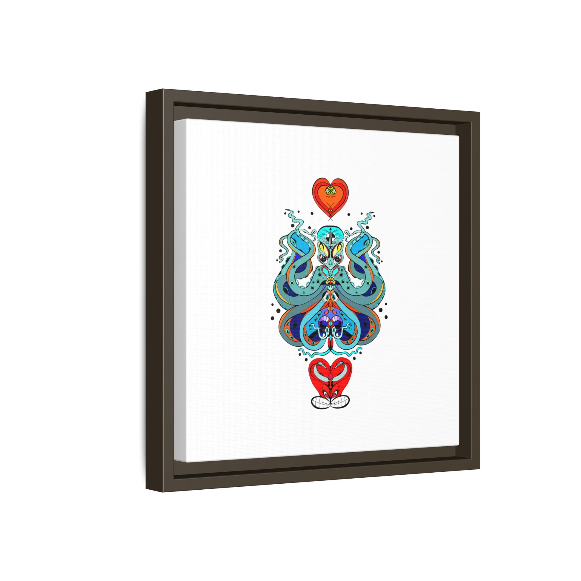 A framed matte canvas print that brings playful, modern folk art into calm, curated spaces. Bright, layered colors and crisp linework sit on a clean white field, letting the whimsical mirrored motif breathe. The slim black frame and matte finish create a quiet, gallery-ready presence — bold without shouting. Hang it alone for a focused statement, or pair it with other minimalist pieces to add a pop of personality to a living room, hallway, or creative studio.