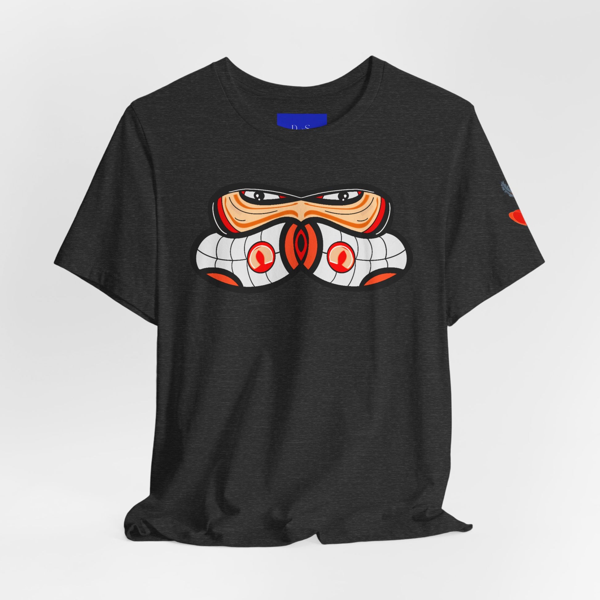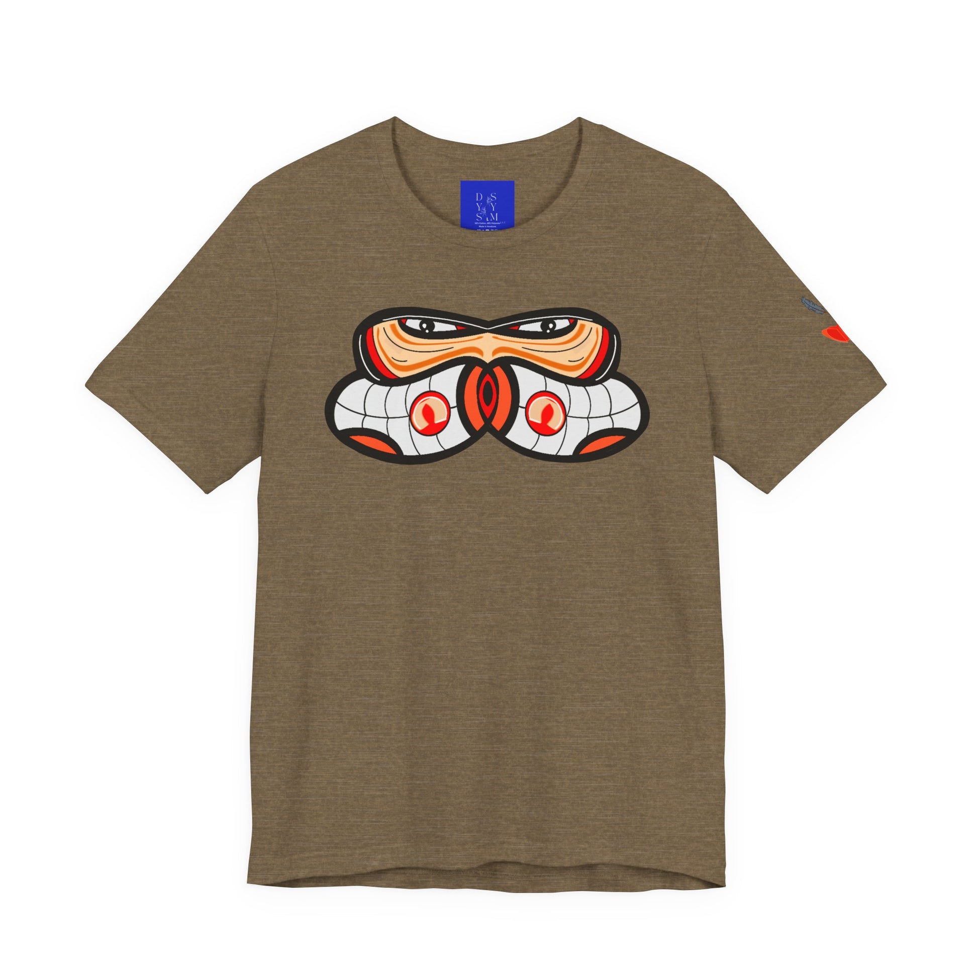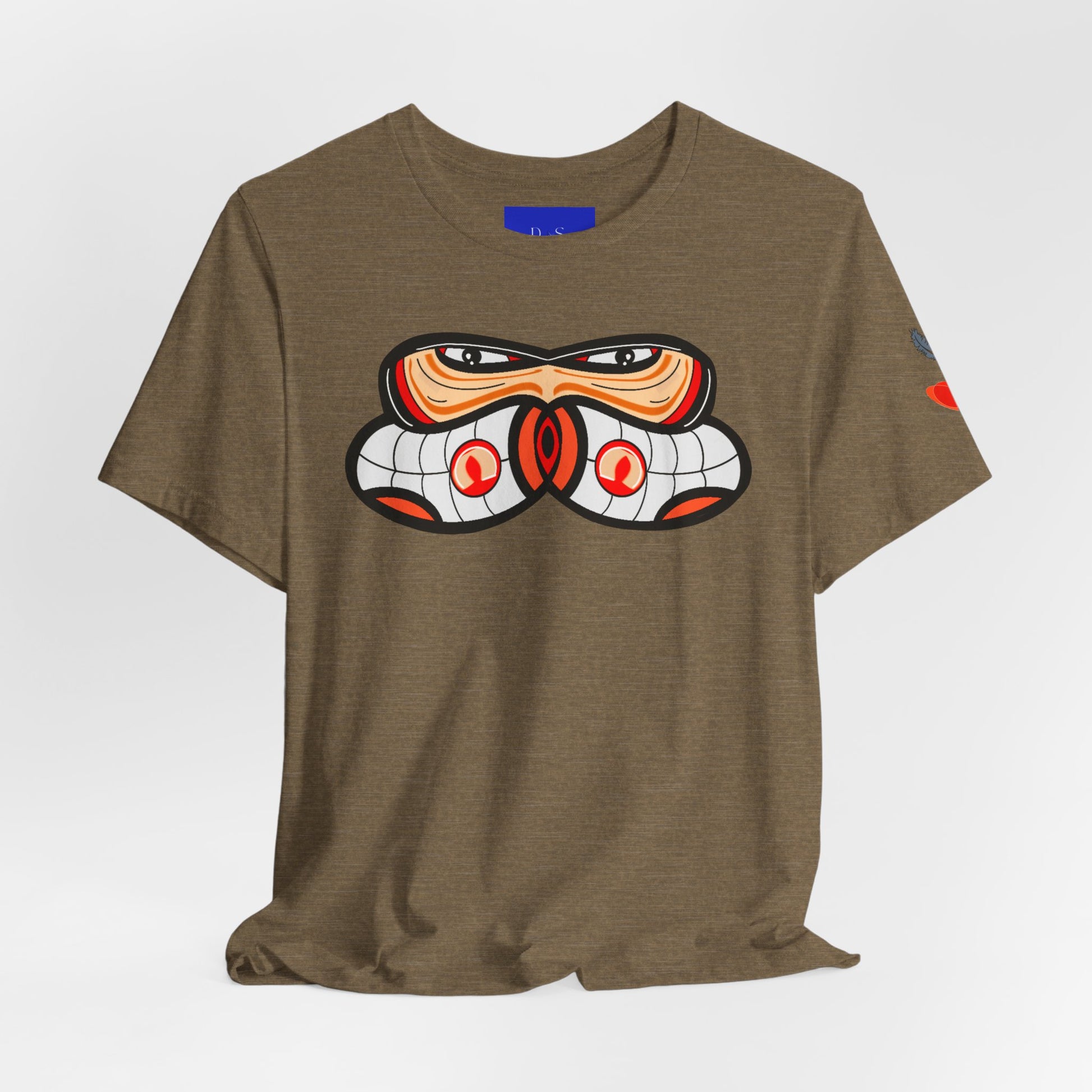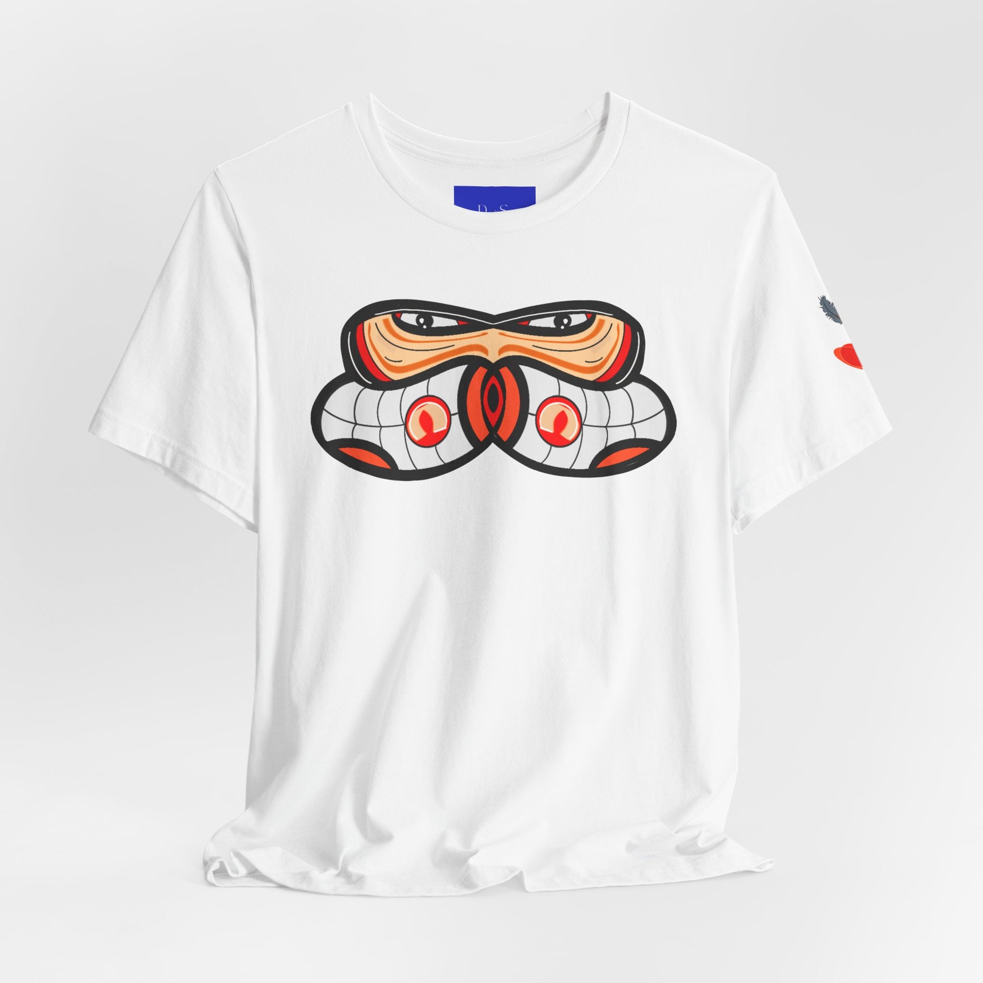 This lightweight jersey tee brings a bold, contemporary take on Northwest Indigenous-inspired art to everyday wear. The white crew neck showcases a centered graphic with clean lines and warm earth tones — an abstract, mask-like motif that reads as both striking and thoughtful. Soft Airlume combed cotton keeps the shirt breathable and comfortable for long days out or layered looks. Subtle sleeve accents add a hint of detail without overwhelming the calm silhouette. Wear it to gallery nights, coastal walks, or coffee catch-ups when you want a quiet statement that starts conversations about craft and place.